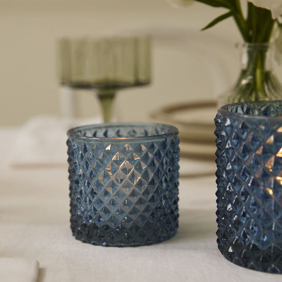 Bring a striking pop of color to wedding or event tables with the sapphire blue glass Florentine Votive, featuring angular diamond texture across the surface. Pair with the blue Eleanor or Elodie Collections for a colorful, elevated look. A basic cylinder shape gives a happy glow when filled with a votive candle. Pair both sizes together for a coordinated display. We recommend gently handwashing to protect color.