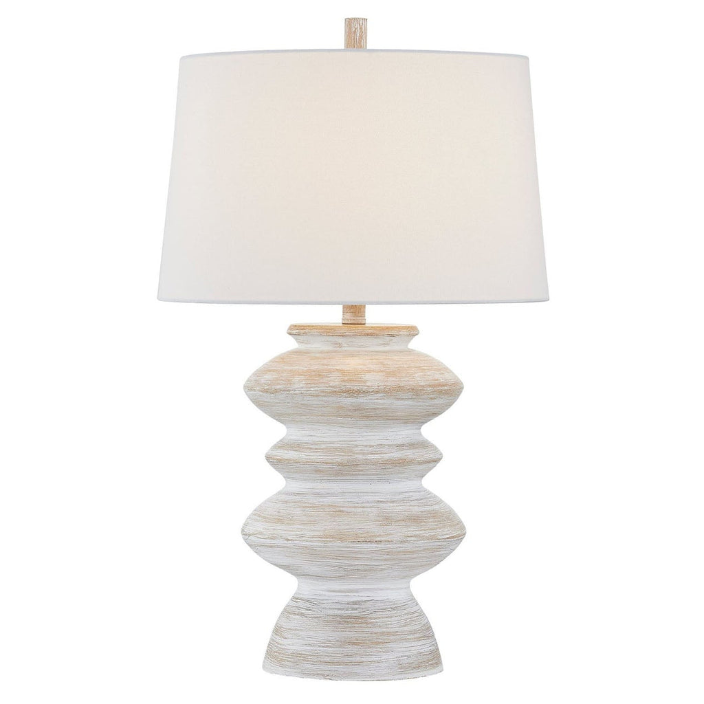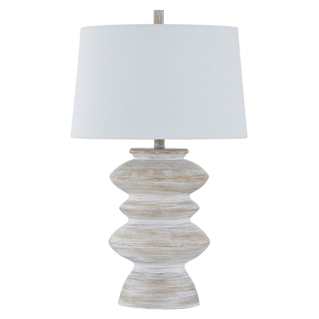 Designed to captivate, this table lamp features a striking ridged silhouette finished in a rustic distressed wash, adding texture and artistic appeal. Its well-balanced form seamlessly complements both transitional and modern interiors. The whitewashed base is beautifully paired with a crisp white linen tapered drum shade, complete with a matching harp and finial, creating a refined statement piece.