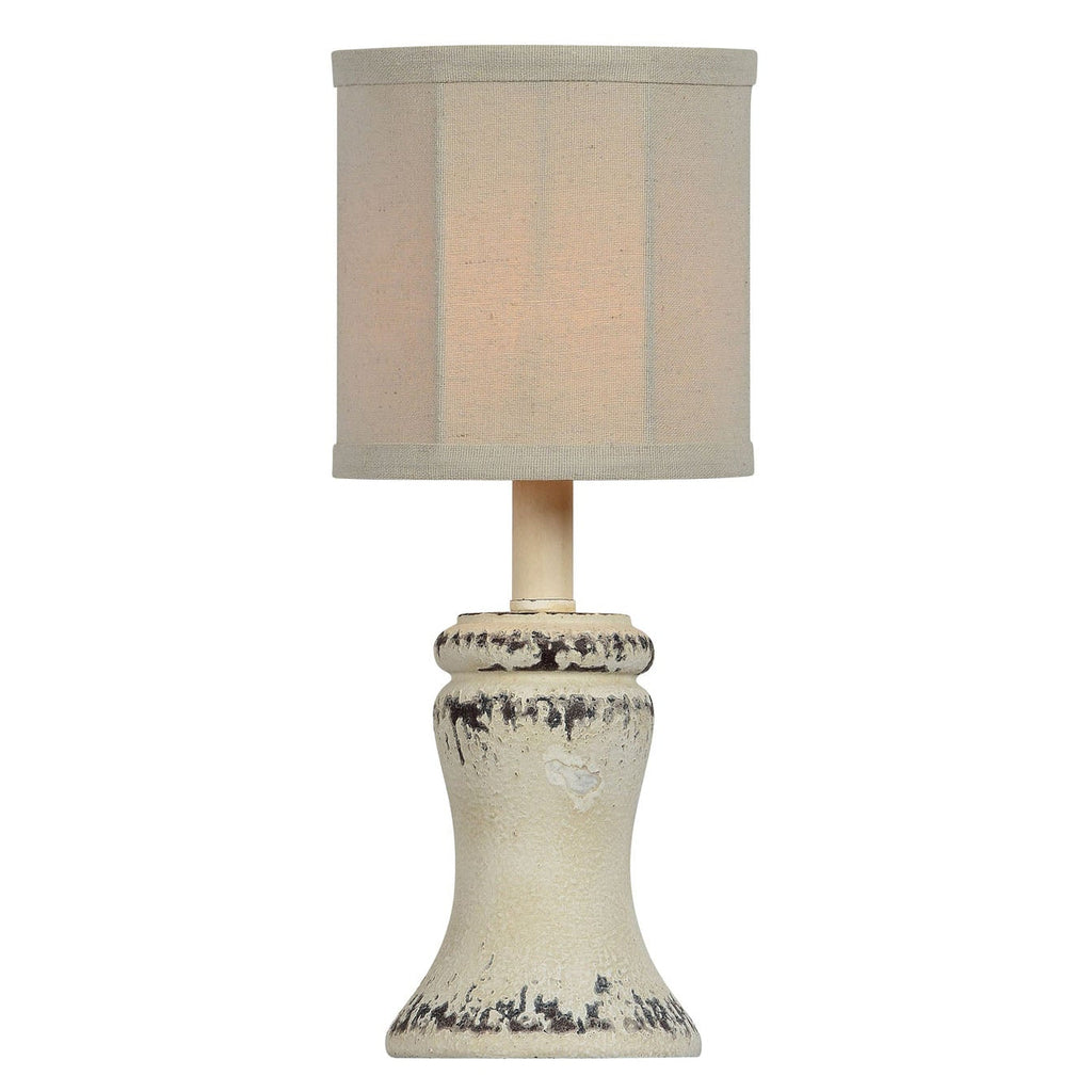 Short and sweet. This mini lamp is a necessity for a small space that might need a little extra light. Bellamy is done in a beautiful antique white with black distressing giving it a charming and rustic feel. Takes a Candelabra base-style bulb. Its base is a curved hourglass shape, flaring outward at the top and bottom for a sculptural look and it tipped off with a natural linen drum shade.
