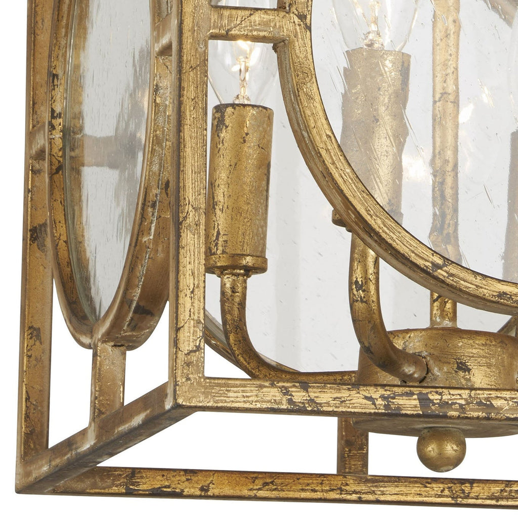 This semi-flush convertible light fixture boasts a striking geometric design with an open cube frame finished in a distressed antique gold tone. Circular panels of seeded glass soften the angular structure, allowing warm, ambient light to filter through. Inside, four candle-style bulbs provide a classic touch, blending modern and vintage aesthetics seamlessly. Its versatile design allows for installation as either a semi-flush mount or a hanging pendant, making it an elegant choice for entryways, dining areas, or living spaces that call for a statement piece with a refined yet aged appeal.