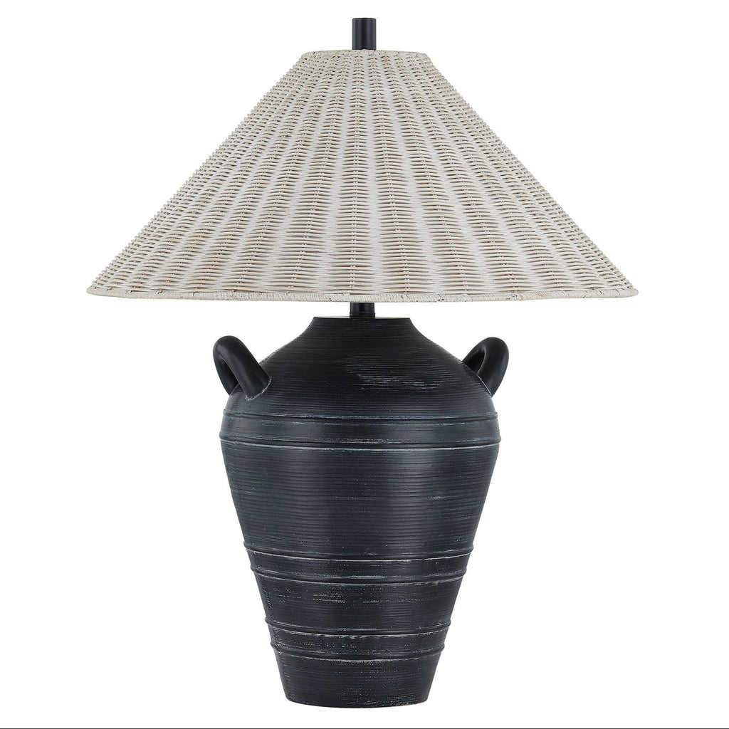 The Brookfield Table Lamp is a sophisticated statement piece, expertly crafted with an urn-shaped silhouette that includes the arm and a bold black finish. Subtle ribbed textures, three pairs of raised rings, and horizontal distressing add depth and character to its design, creating a visually dynamic look. Crowned with an off-white rattan empire shade, it perfectly balances boldness and natural elegance.