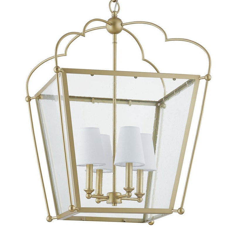 The Covington Pendant adds a timeless elegance to any space with its gold-finished metal frame and clear glass panels. Its classic lantern silhouette is elevated with delicate scalloped detailing, giving it a refined yet charming look. Inside, four candelabra-style lights with white linen shades provide a soft, inviting glow.