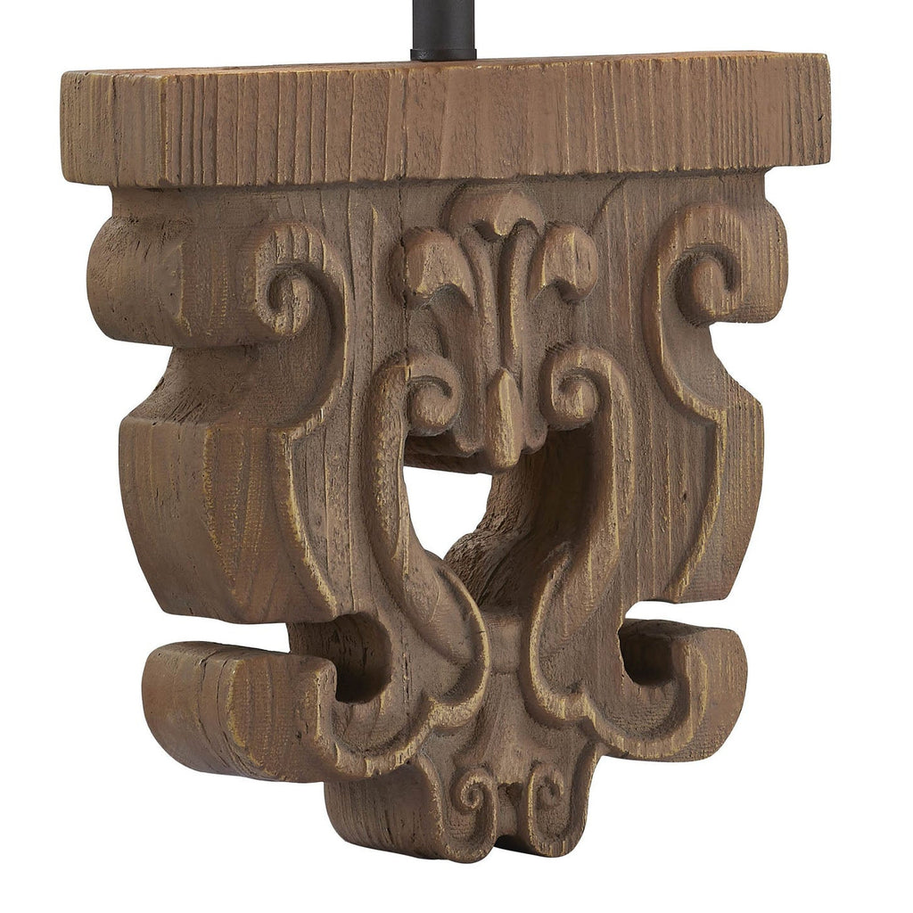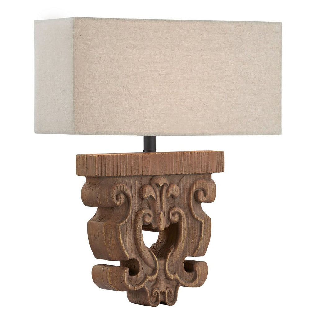 This sconce combines rustic charm with a refined elegance, featuring an intricately carved wooden corbel base that adds a touch of Old-World character. The warm, brown wood tones highlight the sculpted details, while the rectangular linen shade provides a modern contrast, diffusing soft, ambient light. Add to any room for a touch of traditional elements.