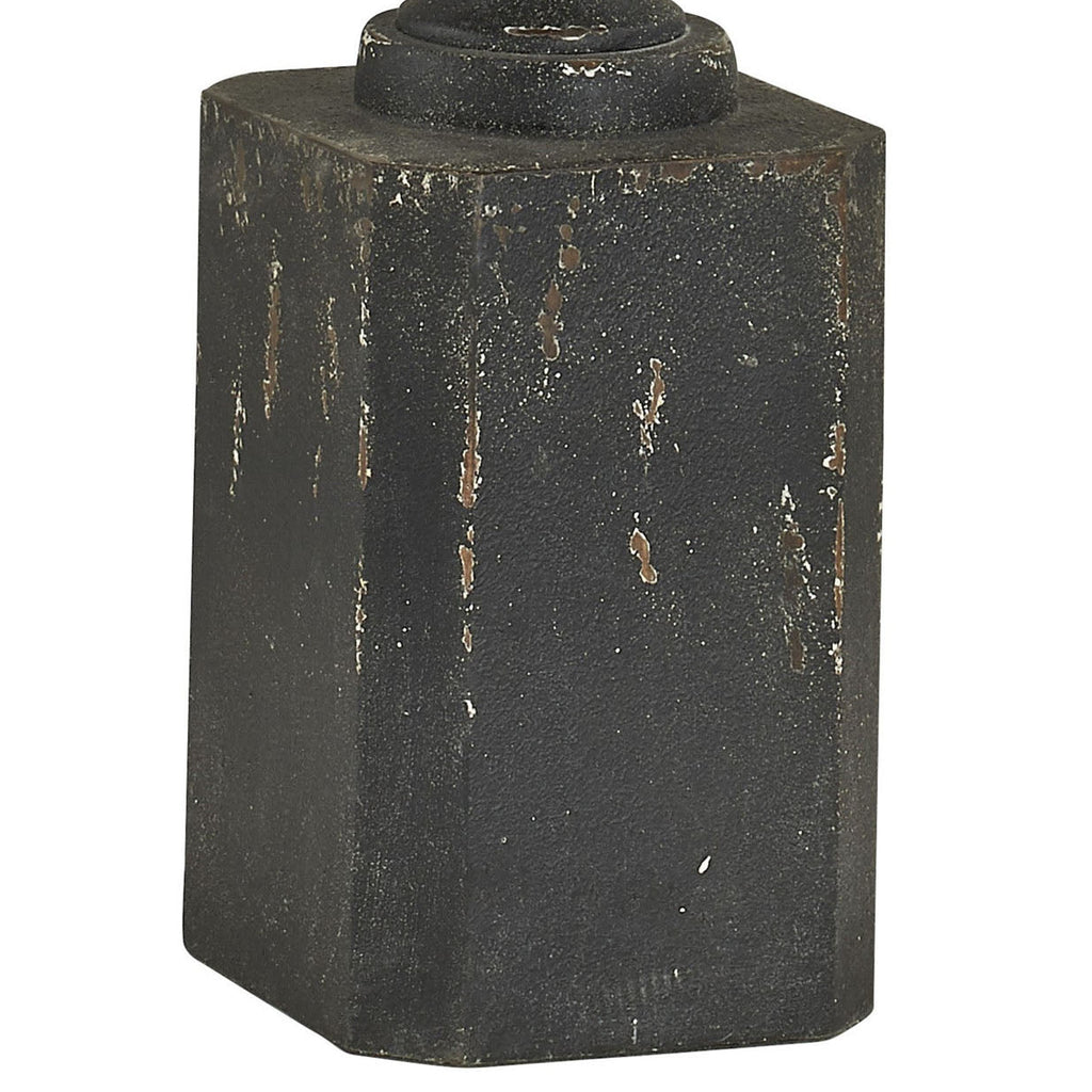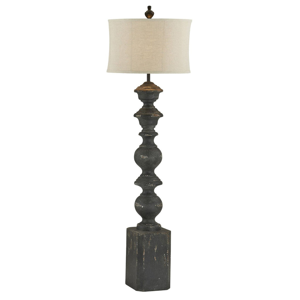 Brings a bold statement with its sculptural silhouette and aged charm. Crafted from resin in a slightly worn black finish and gold accents. , the base features a striking stacked design with turned details, reminiscent of antique wooden balusters. A natural linen shade balances the look with soft texture and warm lighting. Blending rustic and traditional influences, this lamp is a standout piece for spaces that need a touch of timeless character.