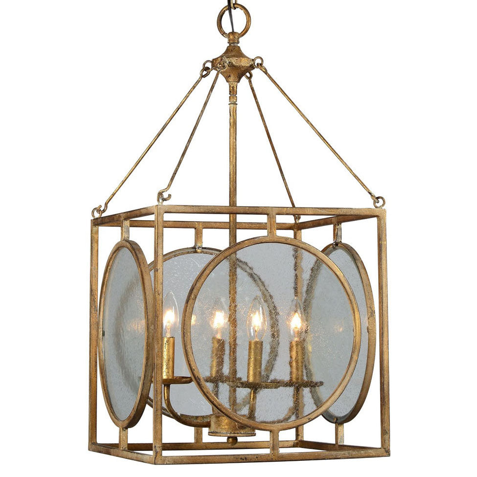 The Fleming Pendant makes a bold statement with its antique gold metal frame and unique geometric design. Featuring a cube-shaped structure with large circular seeded glass panels, this pendant beautifully diffuses light while adding a touch of vintage elegance. Four candle-style lights sit within, creating a warm, inviting glow. Its combination of aged patina and classic design elements makes it a striking focal point.