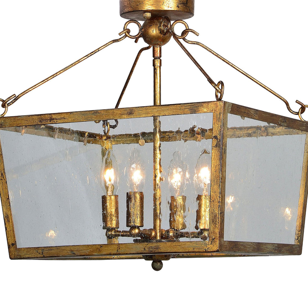 This semi-flush convertible light fixture exudes vintage elegance with a timeless appeal. Featuring a distressed gold-finished metal frame, the fixture is designed with trapezoidal clear seeded glass panels that add texture and depth while softly diffusing light. Suspended by delicate arms and a chain, it offers flexibility as a semi-flush mount or hanging fixture. The candelabra-style interior holds multiple lights, creating a warm and inviting glow.