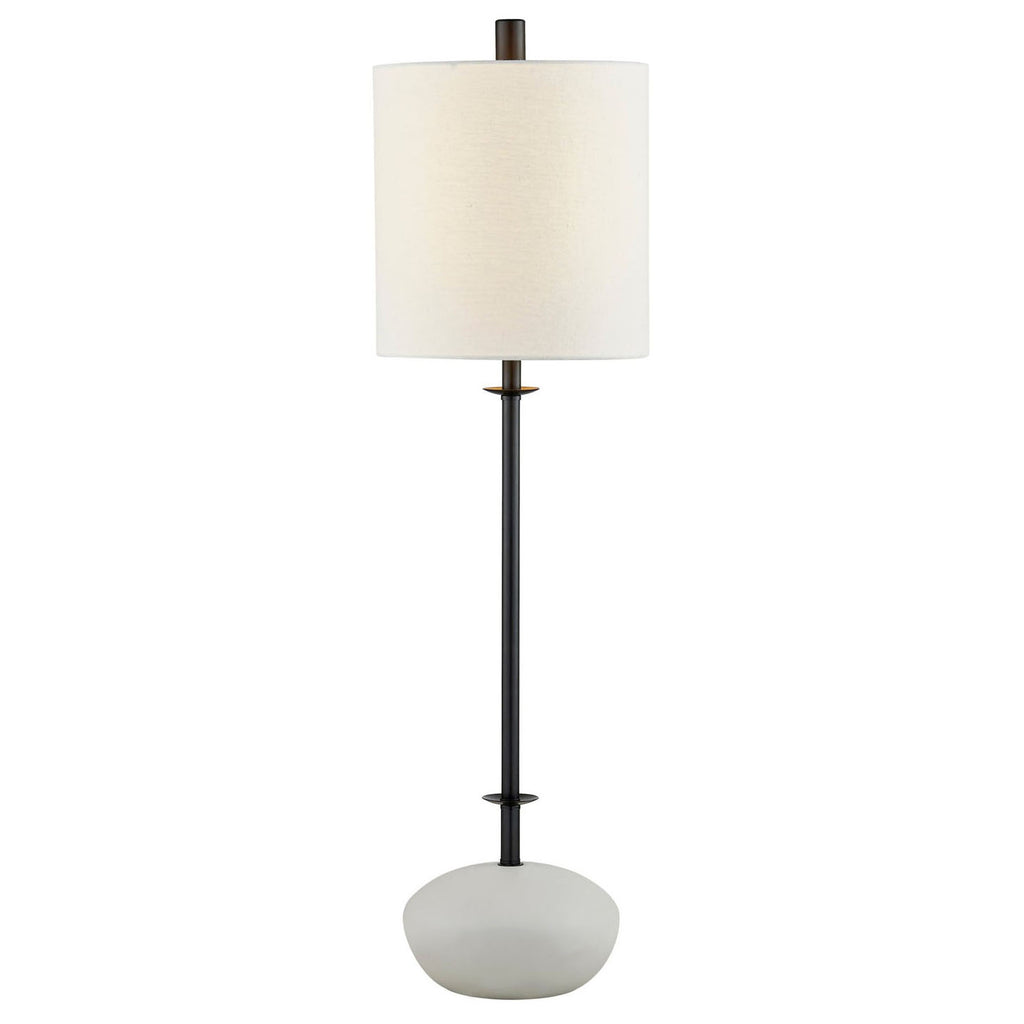 Experience elegance with our Hughes Table Lamp. Its slim design and unique materials create a captivating look that enhances any room. Sitting on a cement base, the sleek black stem rises gracefully, with decorative bobèches features at the top and bottom. The white linen shade softens the light for a cozy atmosphere. While the contrast from the white shade, black stem, and gray base creates a contemporary color block effect.