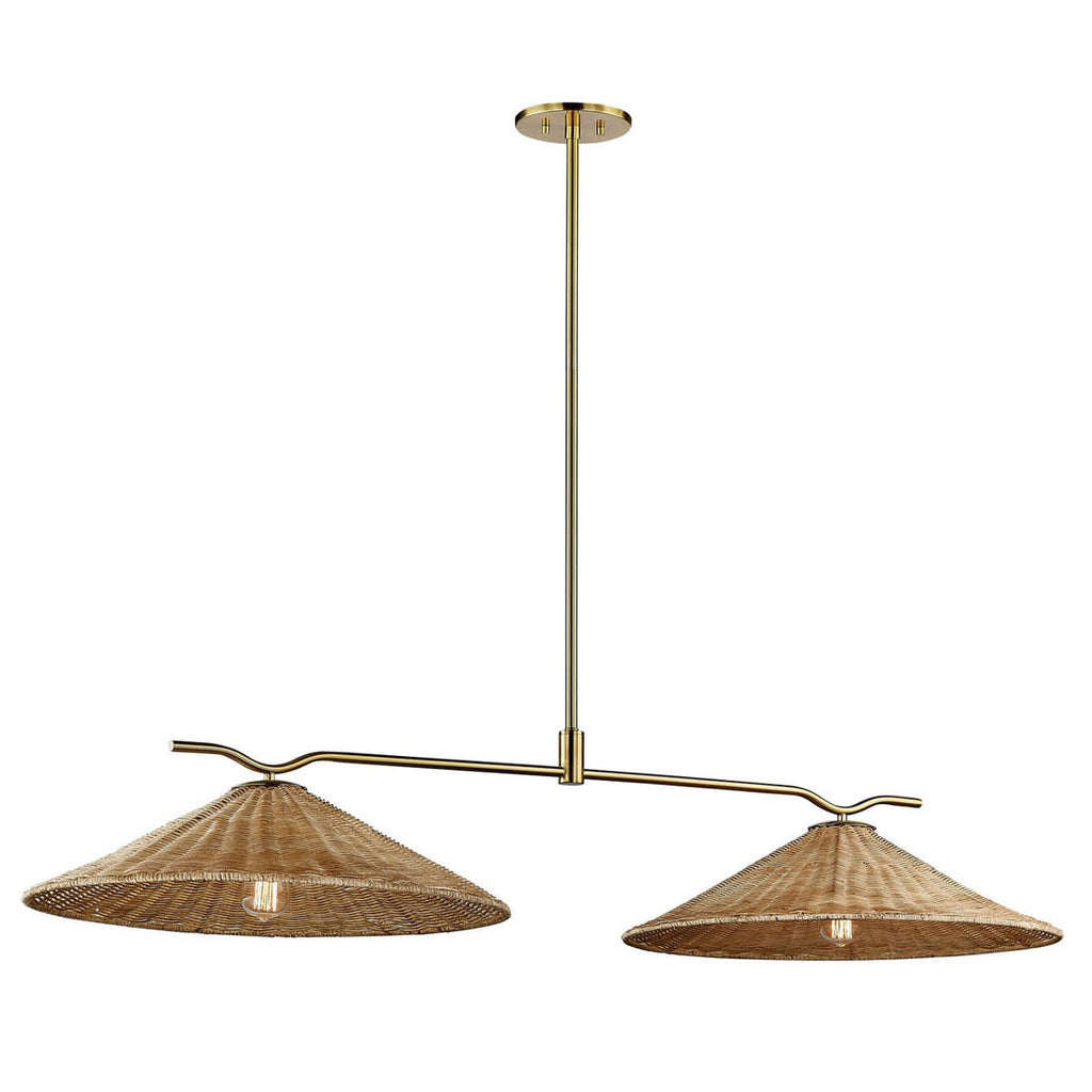 This bar light effortlessly combines natural texture with sleek elegance. Featuring two handwoven rattan shades in a warm, organic tone, it brings a relaxed, coastal-inspired feel to any space. The shades are suspended from a gracefully curved metal frame in a rich brass finish, adding a touch of modern sophistication. A slim, streamlined downrod extends from a round ceiling canopy, keeping the look clean and airy. Its minimalist and organic design adds a bold, fashionable flair, infusing your space with a warm, natural ambiance.