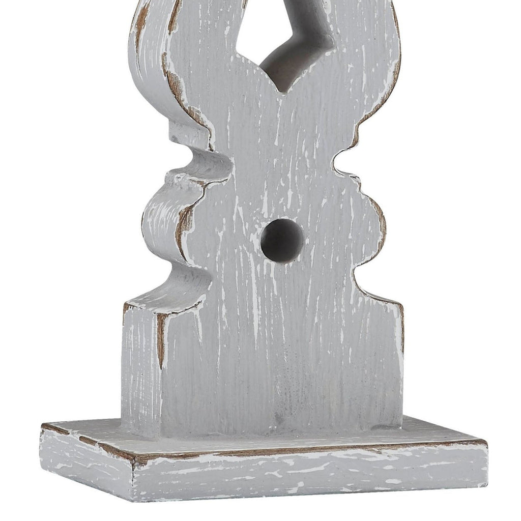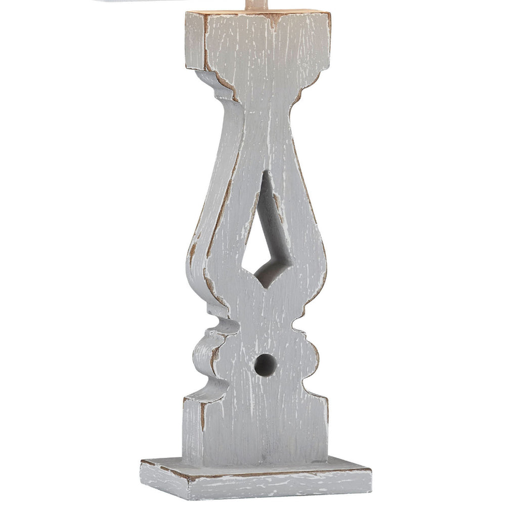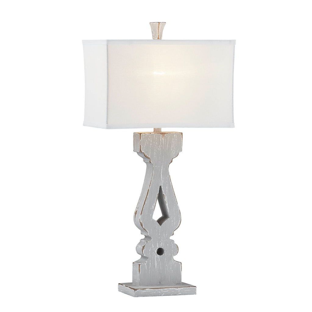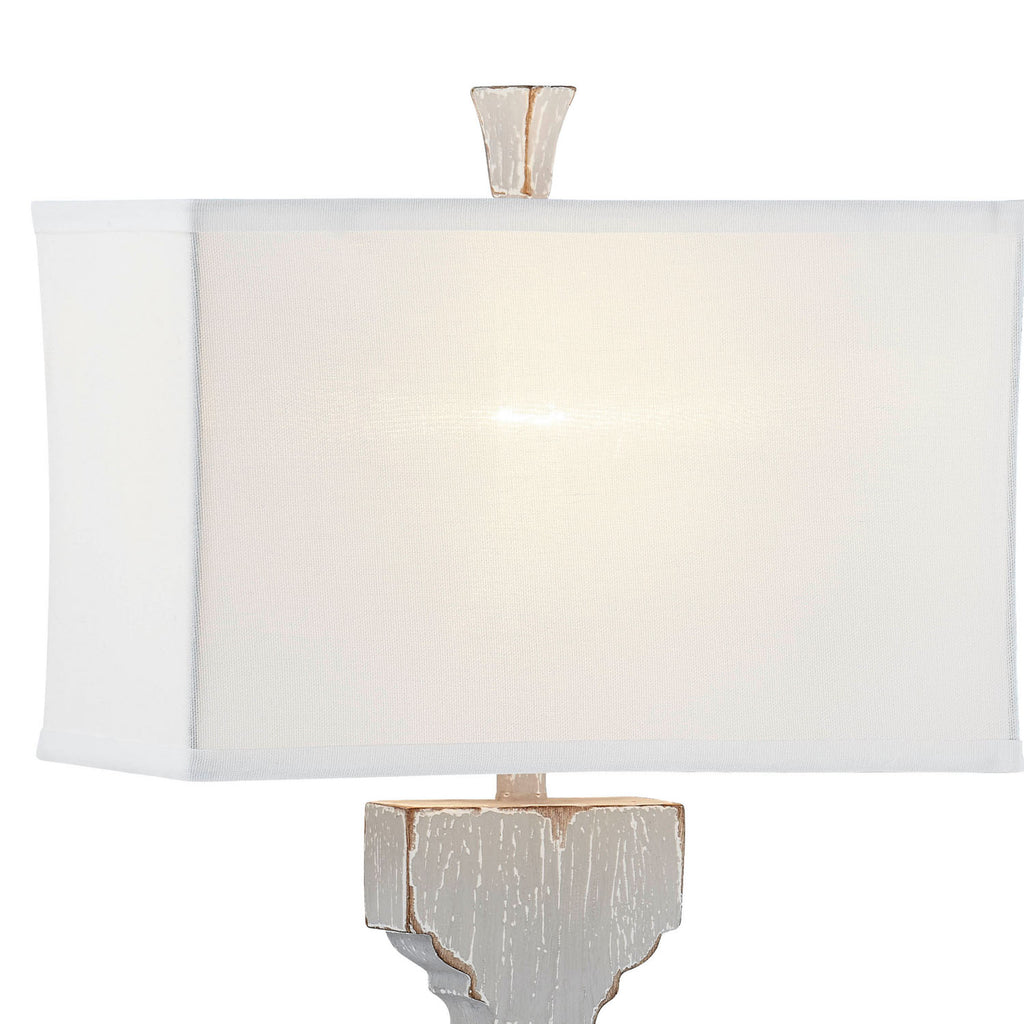 Beautifully designed with its carved-out pieces, standing 35” tall, and features a distressed light grey wash. Its rectangle linen softback shade completes the transitional look for this lamp. It distressing adds a touch of vintage charm balancing the geometric design details. Perfect for any style from farmhouse to modern.