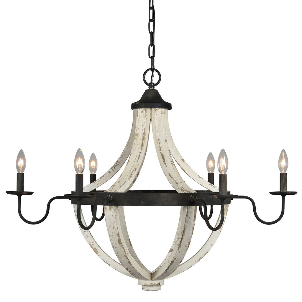 This chandelier brings a rustic yet refined touch to any space with its charming combination of distressed wood and metal. The gracefully curved wooden slats, finished in a weathered white, form an open globe shape, allowing light to flow effortlessly. A dark, aged metal band encircles the frame, complementing the six elegantly curved arms that extend outward, each supporting a candle-style bulb holder. The contrast between the distressed wood and the blackened metal gives this fixture a perfect balance of farmhouse charm and classic elegance.