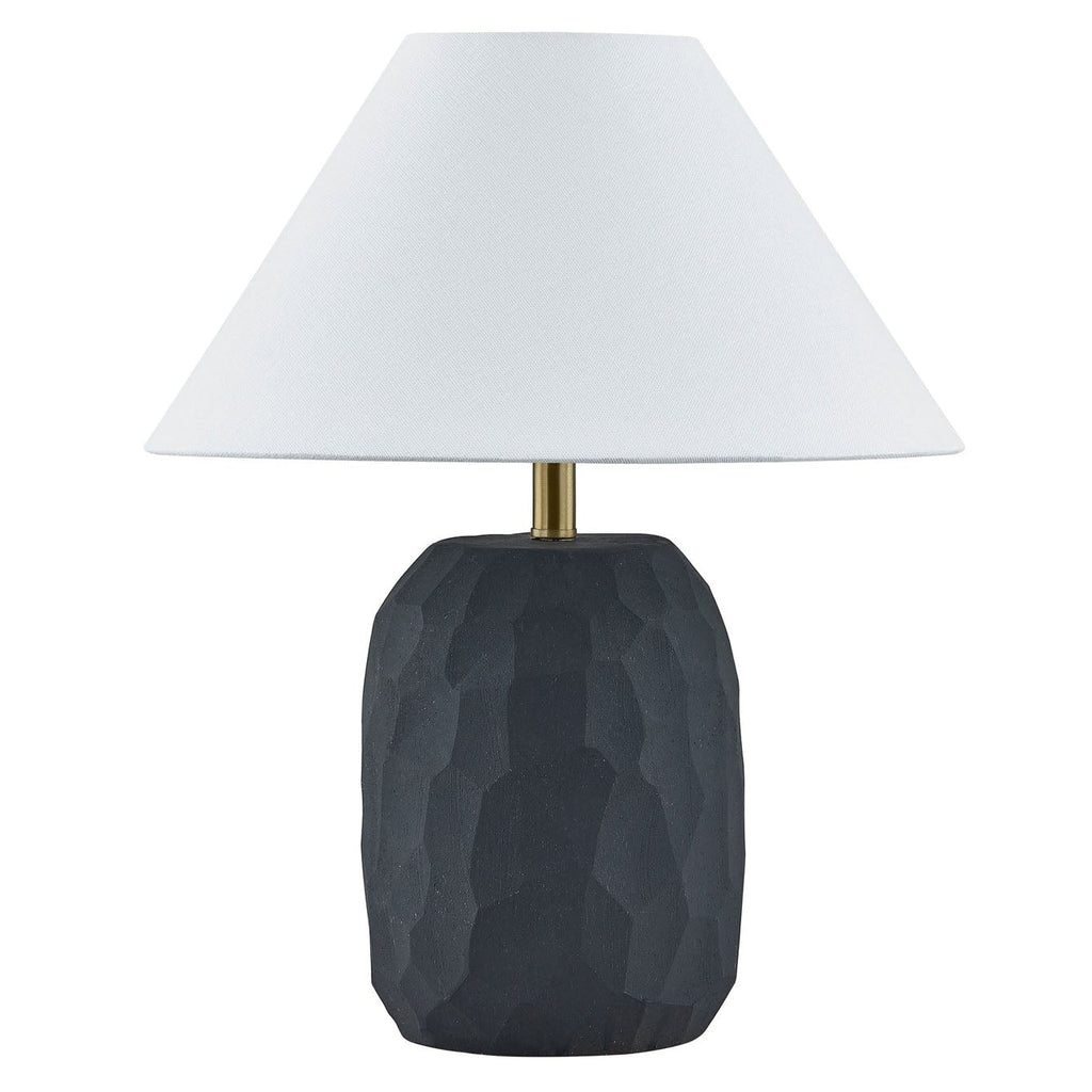 The Roman Table Lamp is a bold matte black ceramic lamp adorned with contrasting gold hardware. Its empire shade makes this the perfect lamp to fit into any modern setting. It base features a unique indented pattern that repeats throughout the whole base gives it a one of kind look.