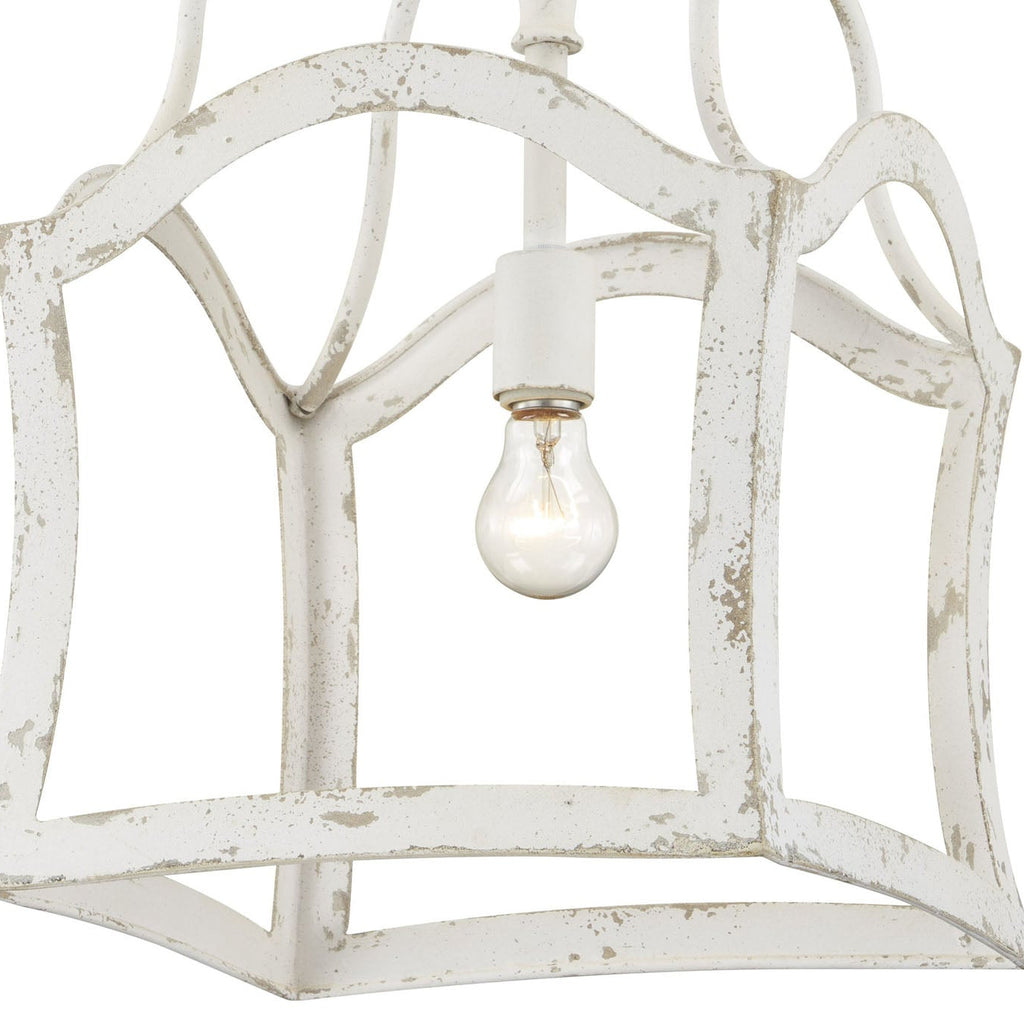 This semi-flush convertible light fixture features a vintage-inspired open lantern design with gracefully curved metalwork in a distressed white finish. The airy, cage-like frame surrounds a single exposed bulb, giving it a charmingly rustic yet elegant appeal. Its versatile design allows for installation as either a semi-flush mount or a hanging pendant, making it perfect for entryways, kitchens, or cozy nooks needing a touch of farmhouse or French country charm.