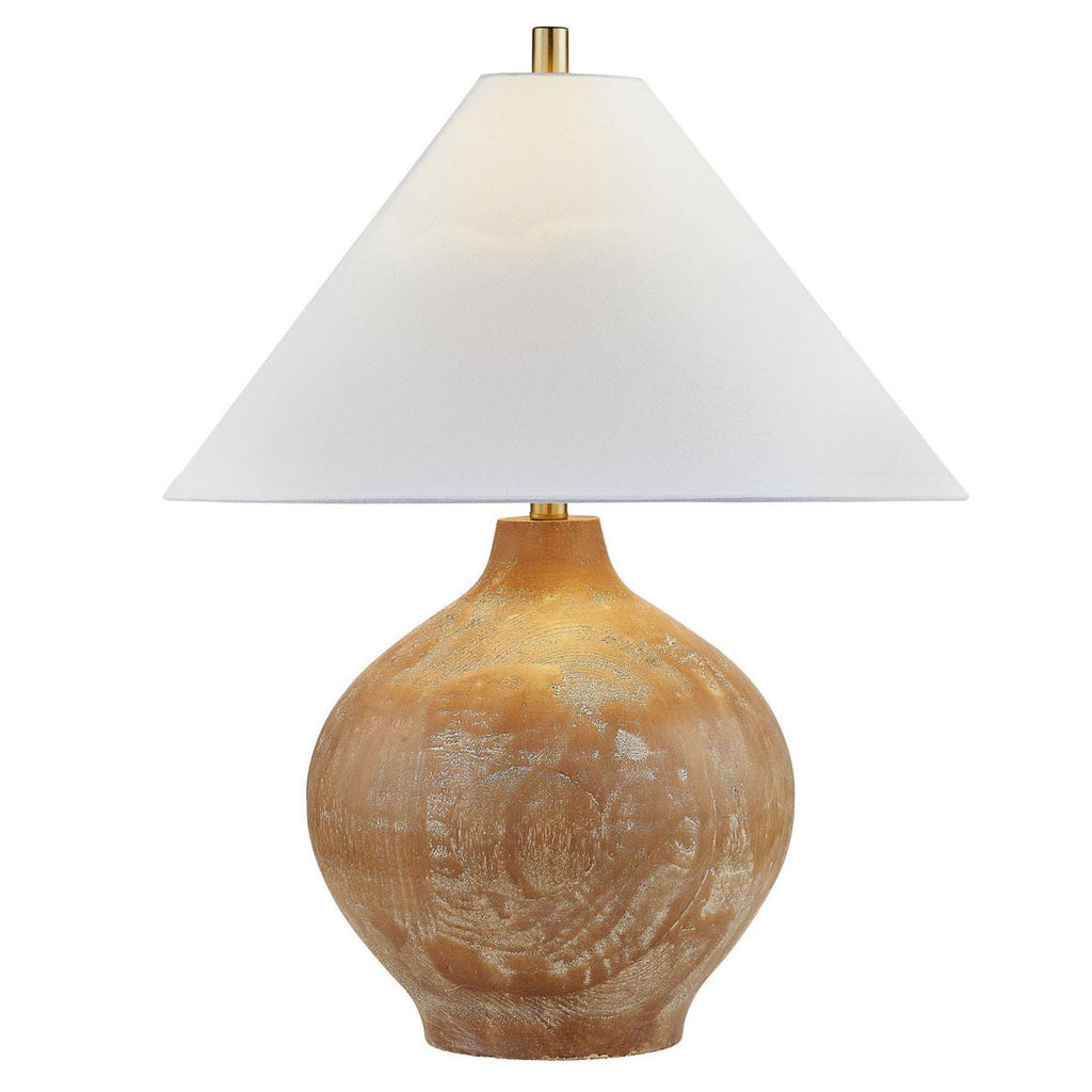 A captivating mid century modern table lamp. Crafted from premium resin, it mirrors the rich texture of wood with exquisite natural grain detail. Its golden brown finish, kissed with a gentle wash, enhances the beauty of its grain, creating a mesmerizing visual symphony. Adorned with gold hardware and crowned with a pristine white empire shade, Serenity exudes a timeless mid-century allure that elevates any space with sophistication and style.