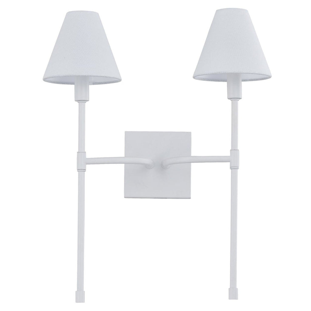 This sconce demands attention with its striking monochromatic look and dual lights. This double-arm sconce exudes timeless elegance with its crisp all-white finish and clean-lined design. Featuring two slender arms extending from a square backplate, it holds a pair of tapered white fabric shades that diffuse a soft, warm glow. The minimalistic yet sophisticated look makes it an ideal choice for traditional, transitional, or modern spaces.