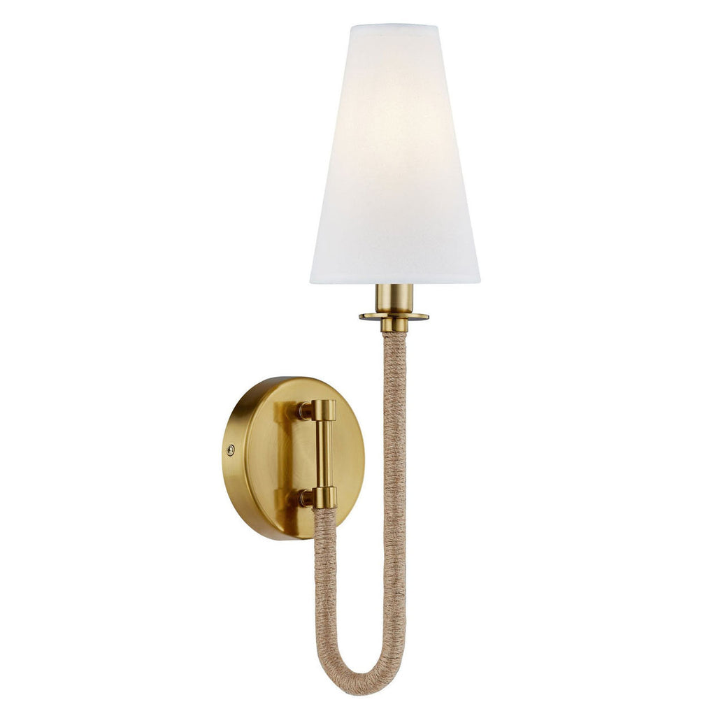 A dramatic and eye-catching light. This sconce blends classic elegance with organic texture for a refined yet relaxed look. Featuring a warm aged brass finish, its gracefully curved arm is wrapped in natural rope, adding a subtle coastal or rustic touch. A crisp white fabric shade softens the light, creating a warm and inviting ambiance.
