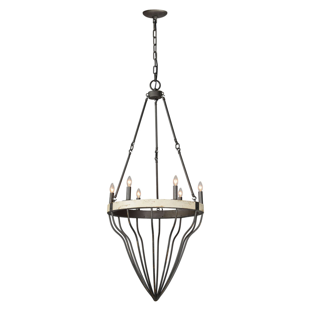 This chandelier blends rustic and industrial charm with its unique cage-like silhouette. The open frame features gracefully curved metal rods in a dark, weathered finish, forming a striking teardrop shape. A distressed off-white wooden ring serves as the foundation for eight candle-style lights, enhancing the fixture’s vintage appeal.