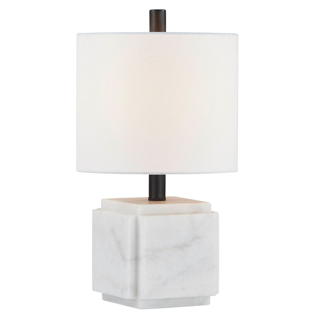 Contemporary look with geometric elements this little guy packs a punch, beautiful white marble with grey veining, matte black hard and finial and lamp neck. Finished off with a a hardback white drum shade. Bring this little guy into your office, reading nook, living room, basically anywhere in your home you want to spice up a bit.