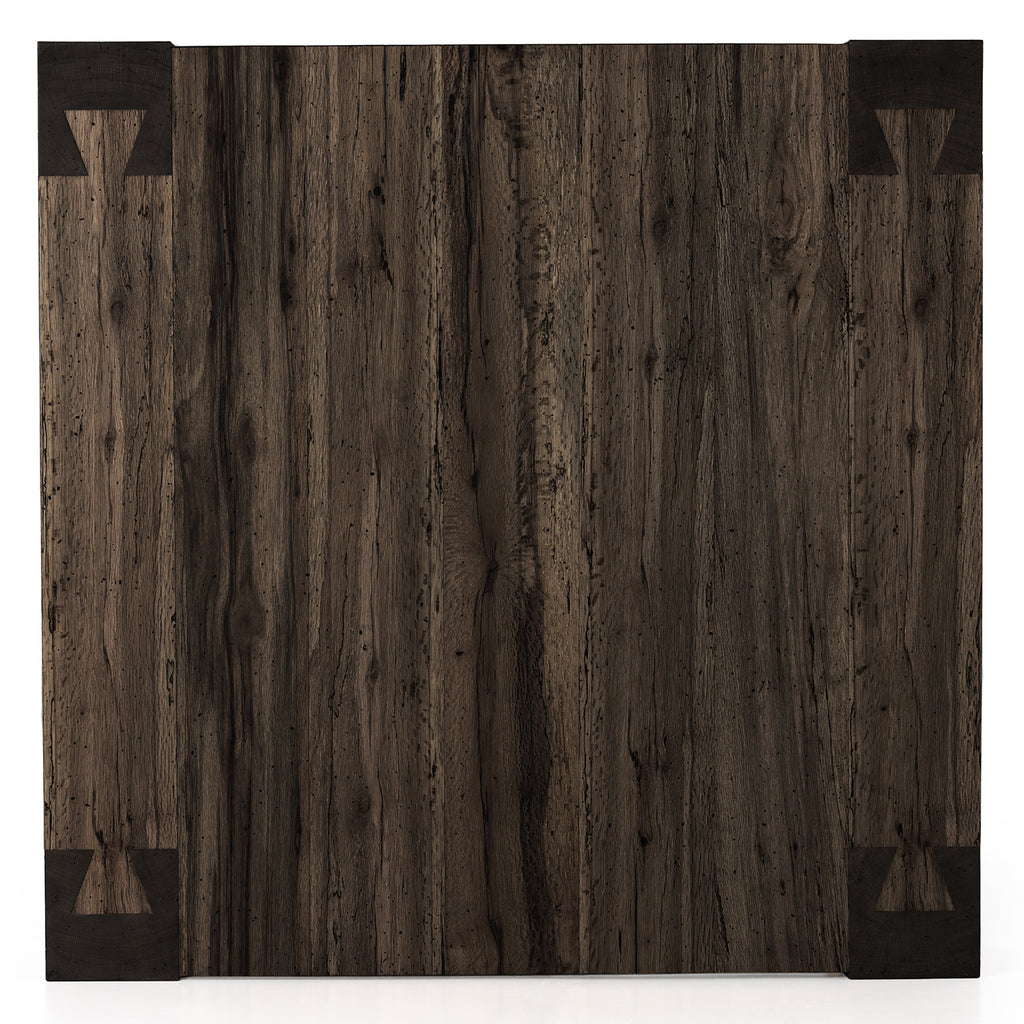 Made from thick-cut oak veneer with a faux rustic finish made to emulate wormwood, this low, large-scale coffee table features chunky squared legs and dovetail joinery detailing.
