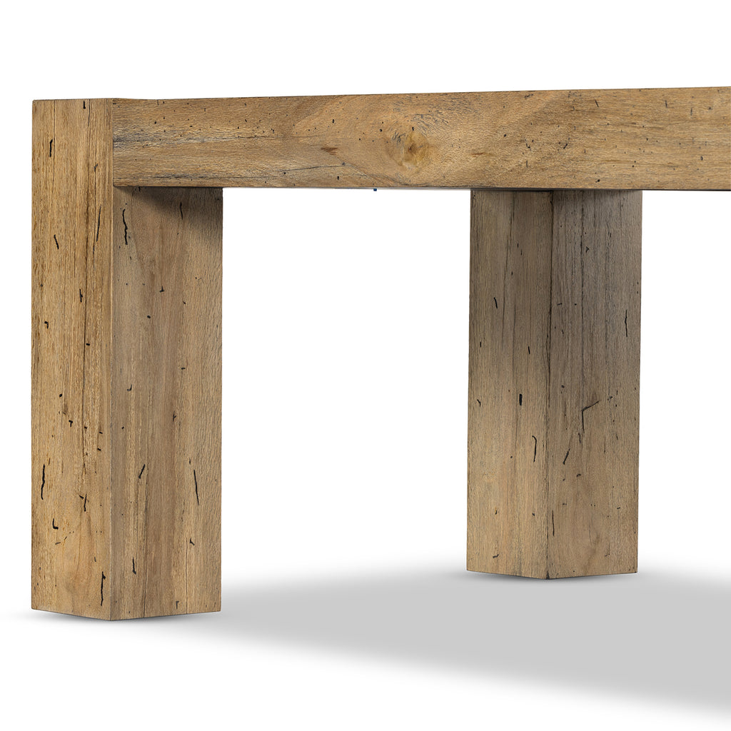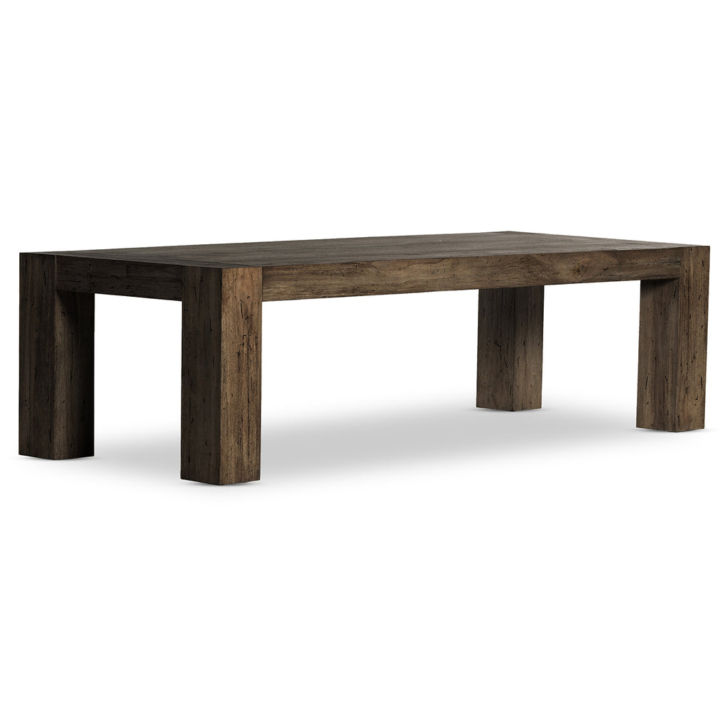 Made from thick-cut oak veneer with a faux rustic finish made to emulate wormwood, this clean-lined dining table features chunky squared legs and dovetail joinery detailing. Seats 10 comfortably.