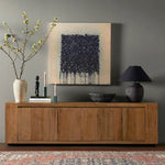 Made from thick-cut oak veneer with a faux rustic finish made to emulate wormwood, this spacious media console features chunky squared legs and dovetail joinery detailing.