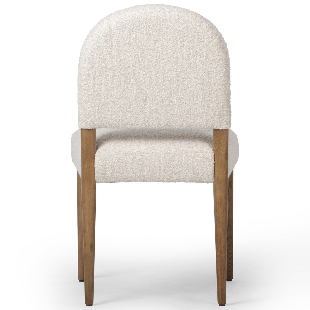 A heritage design gets a modern twist. Simple tapered legs of warm oak mark this dining room chair's traditional form, while an arched seat back upholstered that updates this comfortable seating style.