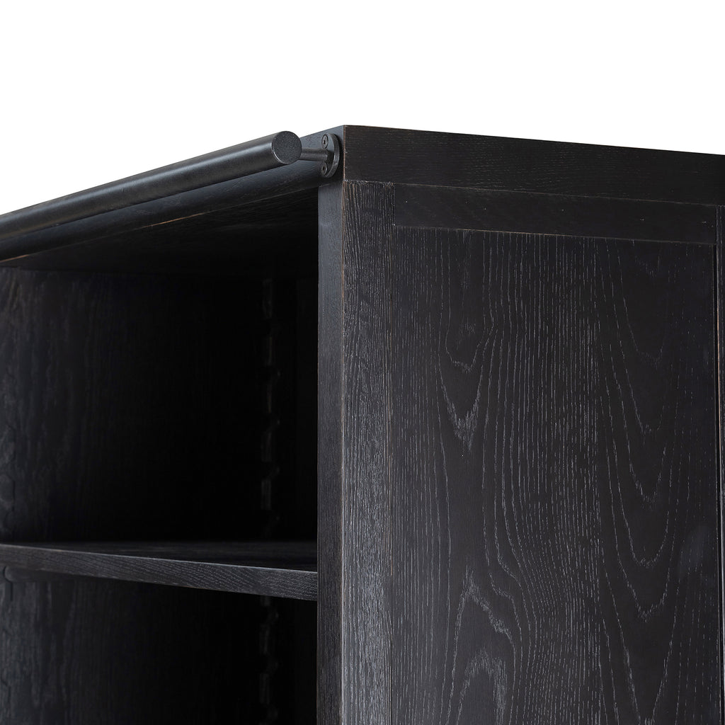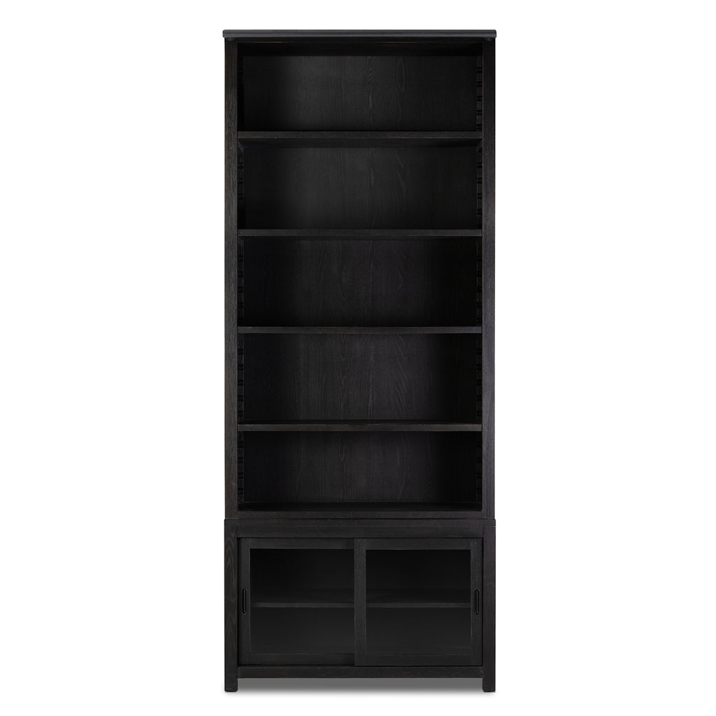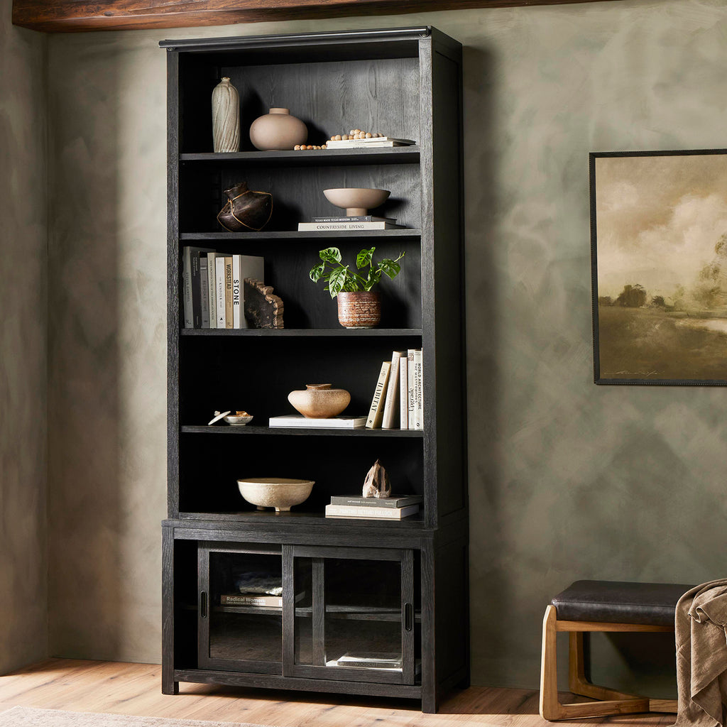 Stately and storage-driven. Inspired by traditional library design, an oak bookcase is finished in a worn black for a vintage European vibe. Glass doors slide open to reveal even more storage.