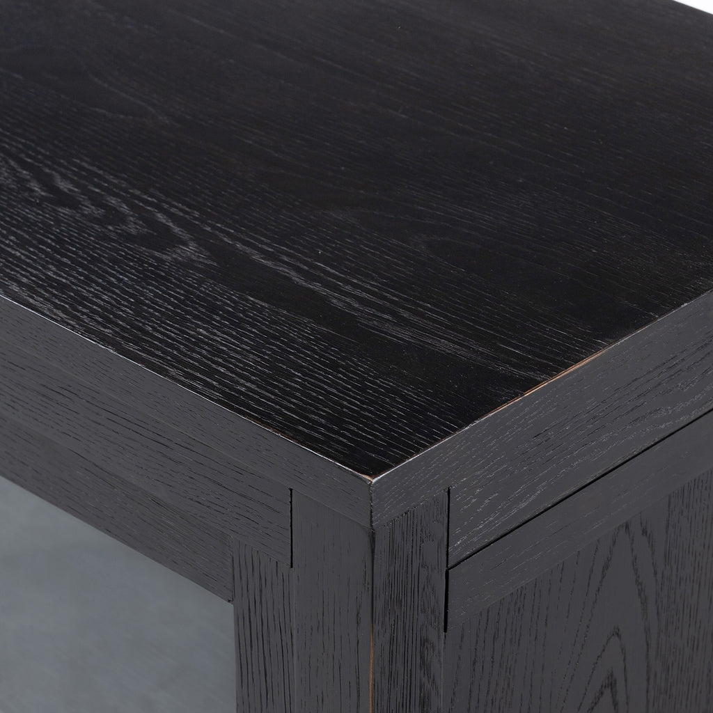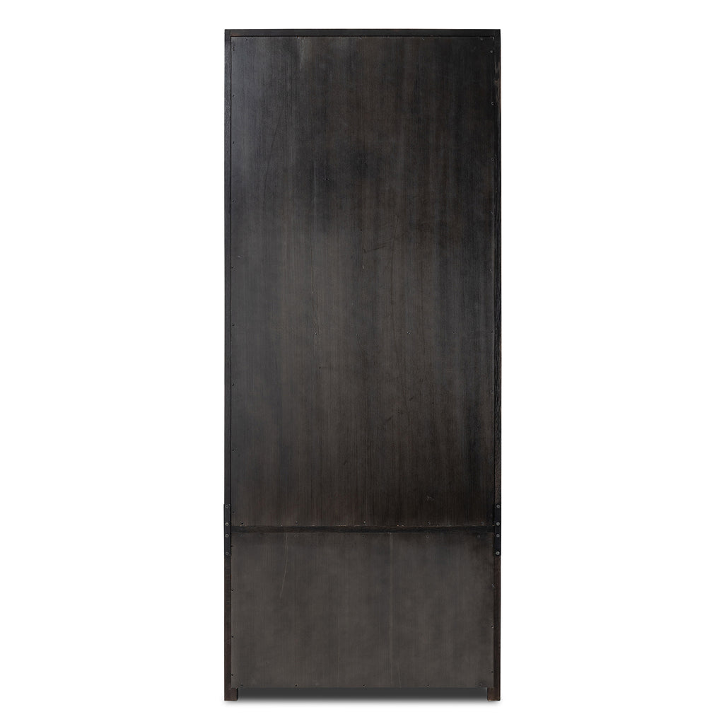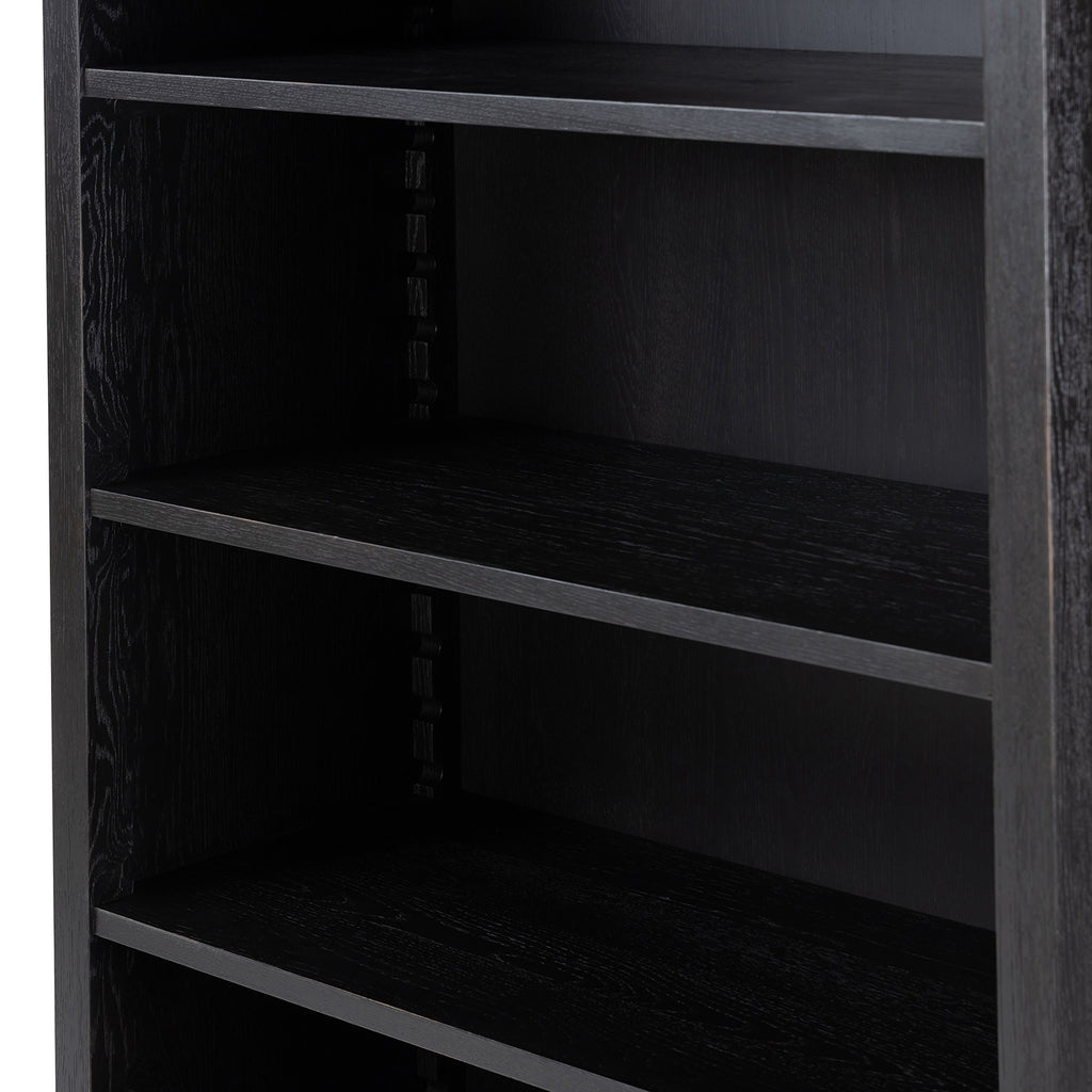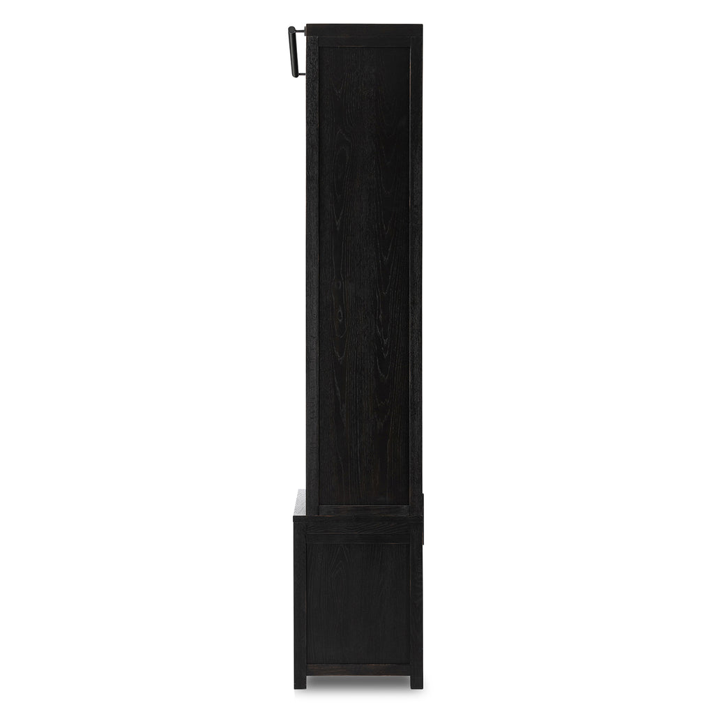 Stately and storage-driven. Inspired by traditional library design, an oak bookcase is finished in a worn black for a vintage European vibe. Glass doors slide open to reveal even more storage.