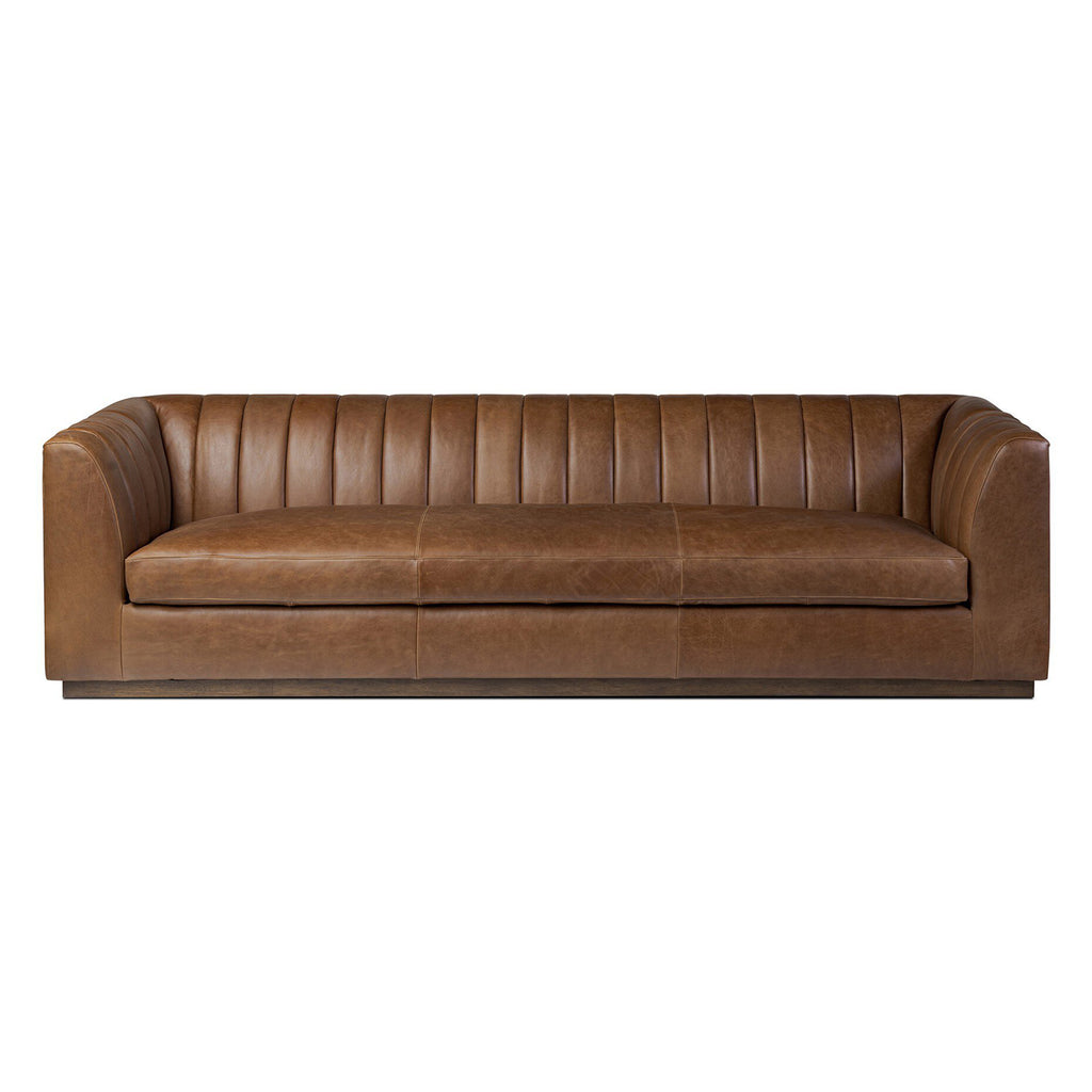 A modern take on a classic shape, this generously sized sofa adopts dramatic channeling in rich mahogany top-grain leather for trend-forward texture and sumptuous sit.