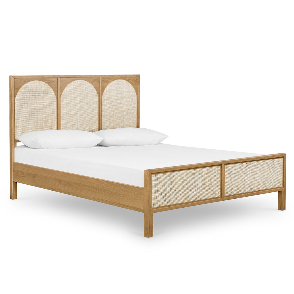 Au naturale. A light oak bed frame features wood-backed cane arches and panel footboard detailing, for a soft, neutral look with lasting modernity. Great in pairs.