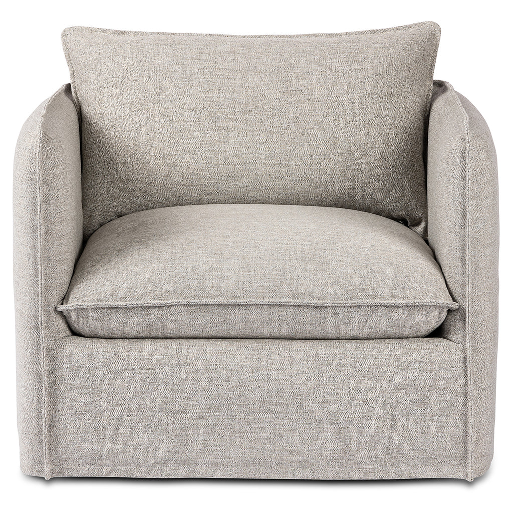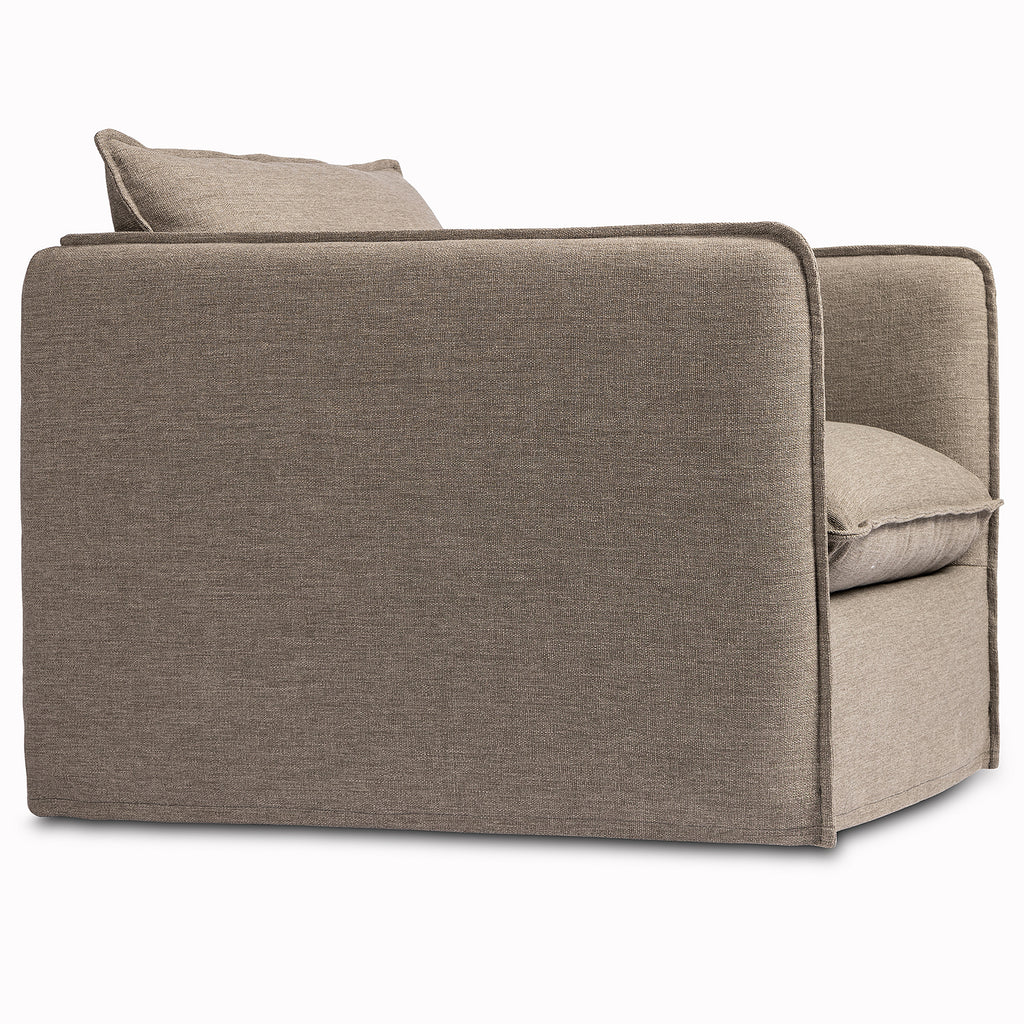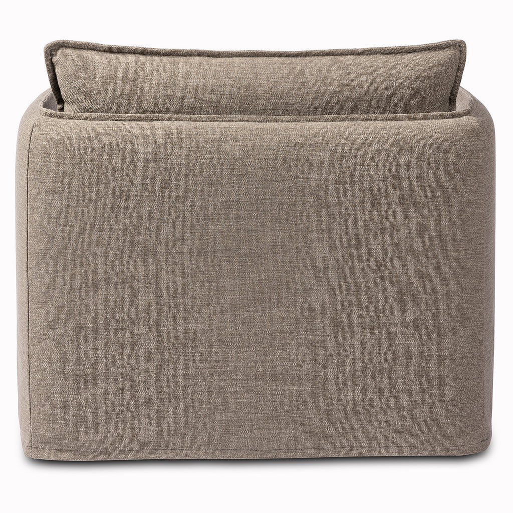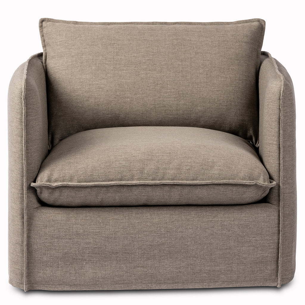 An outdoor interpretation of an in Door silhouette. This 360-degree outdoor swivel chair offers a clean, contemporary feel with relaxed casual comfort. The seat and loose back cushions feature removable, washable slipcovers with a simple flange detail. Sustainably made with zero waste, luxurious Italian upholstery places a new and unique spin on in Door/outdoor seating, offering soft, durable fabric that's highly resistant to sun, stains, mold and abrasion. Cover or store in Doors during inclement weather and when not in use.