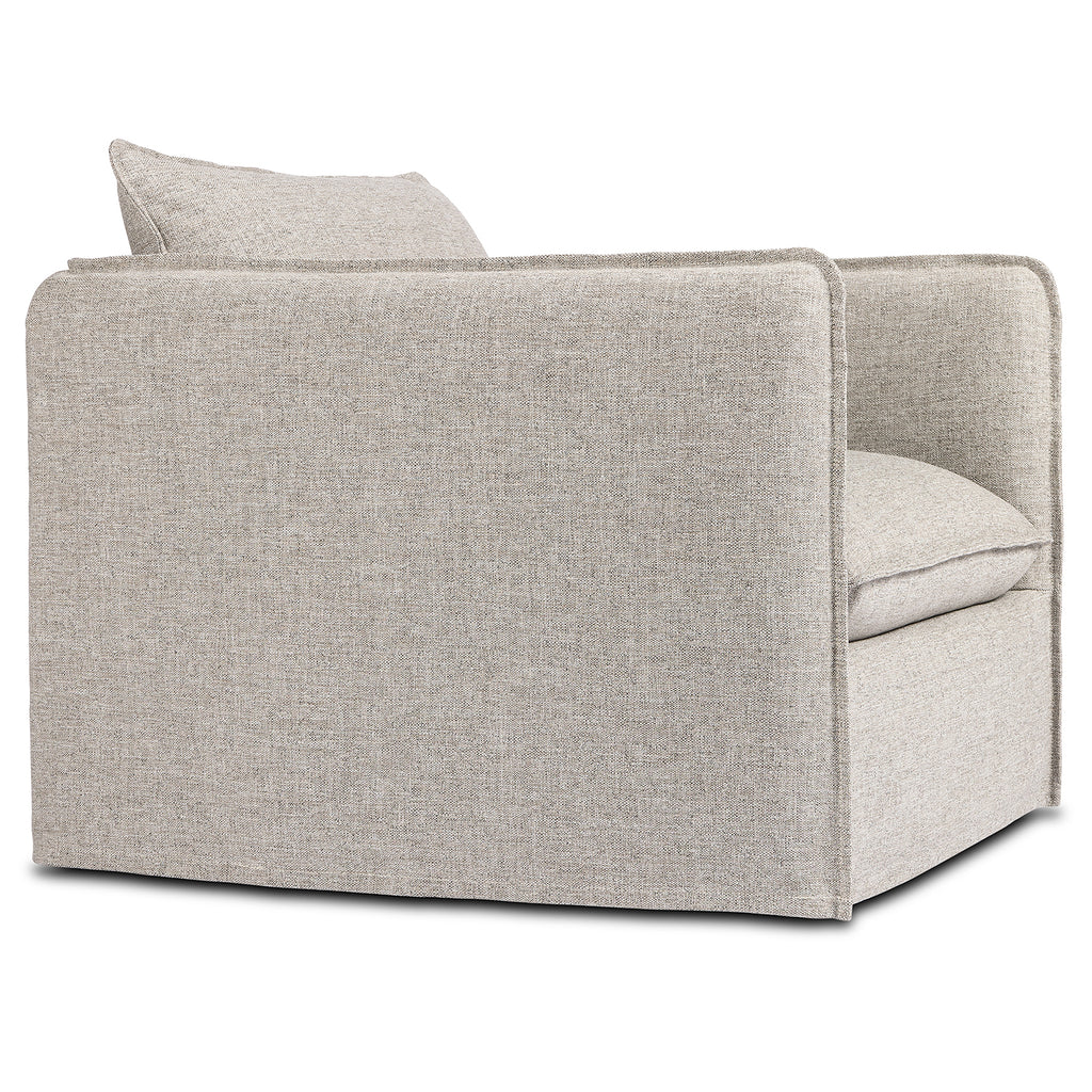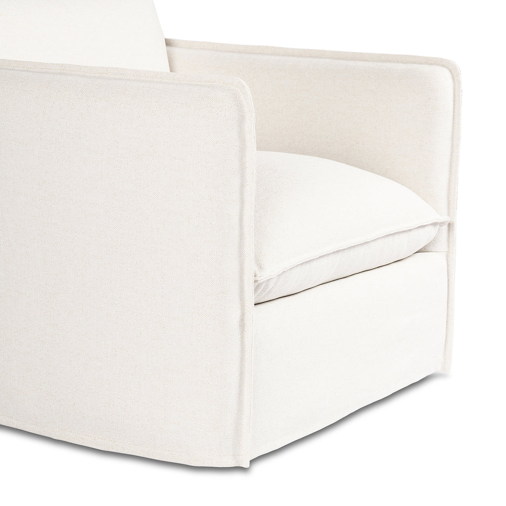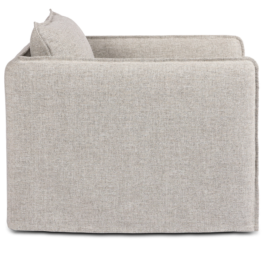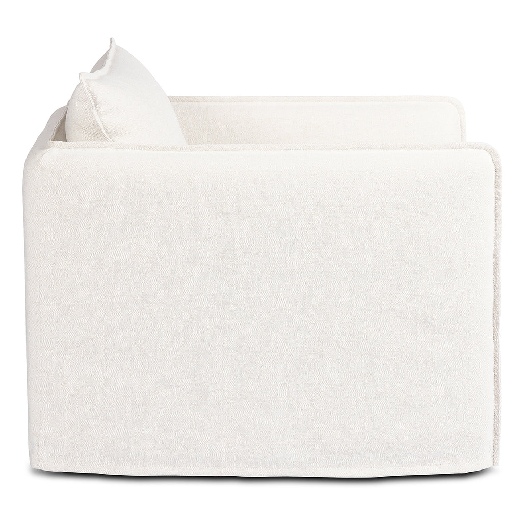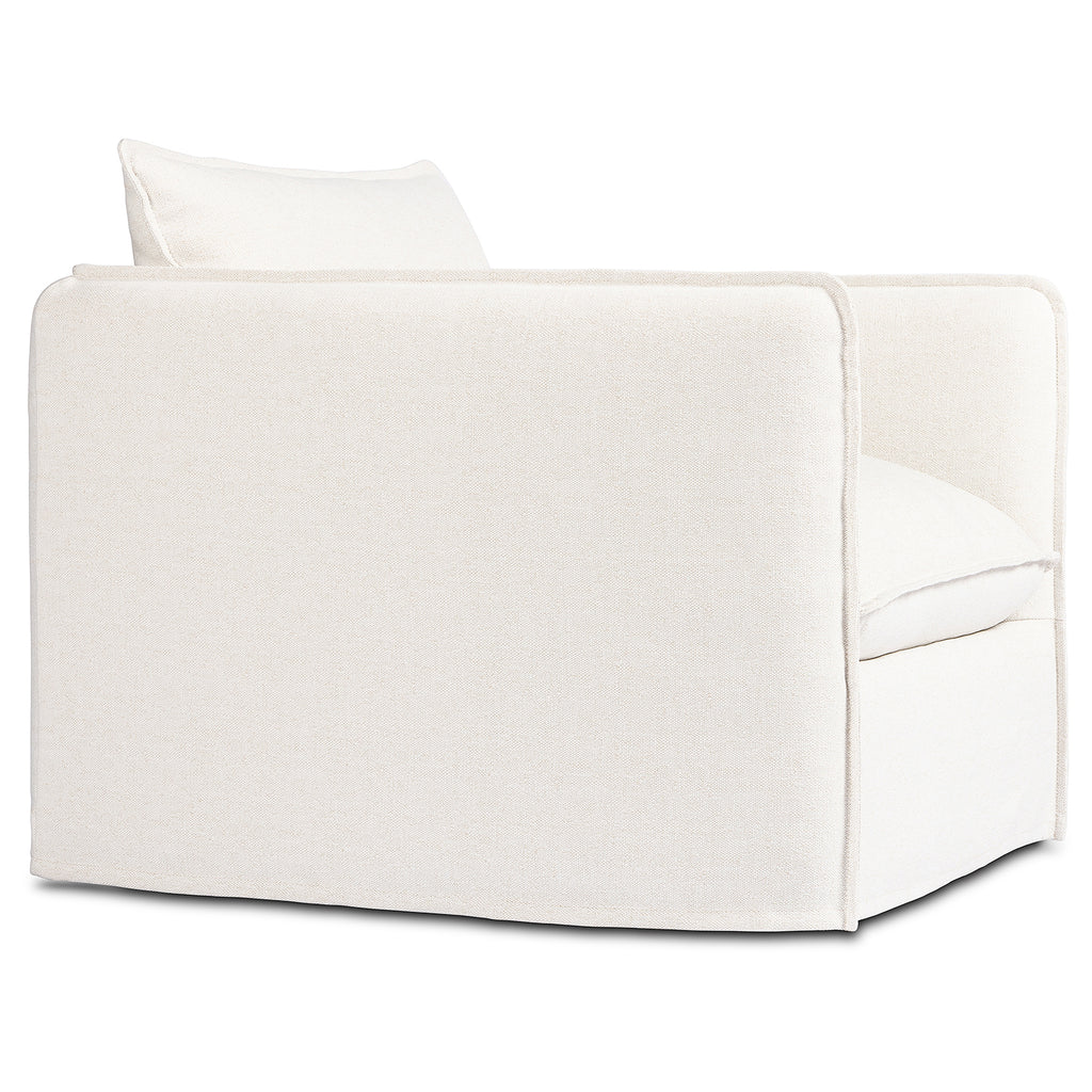 An outdoor interpretation of an in Door silhouette. This 360-degree outdoor swivel chair offers a clean, contemporary feel with relaxed casual comfort. The seat and loose back cushions feature removable, washable slipcovers with a simple flange detail. Sustainably made with zero waste, luxurious Italian upholstery places a new and unique spin on in Door/outdoor seating, offering soft, durable fabric that's highly resistant to sun, stains, mold and abrasion. Cover or store in Doors during inclement weather and when not in use.