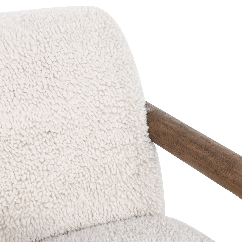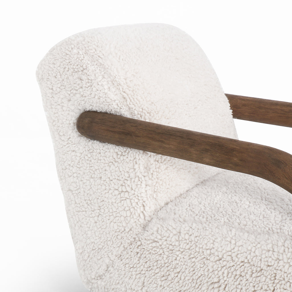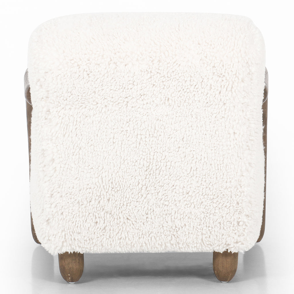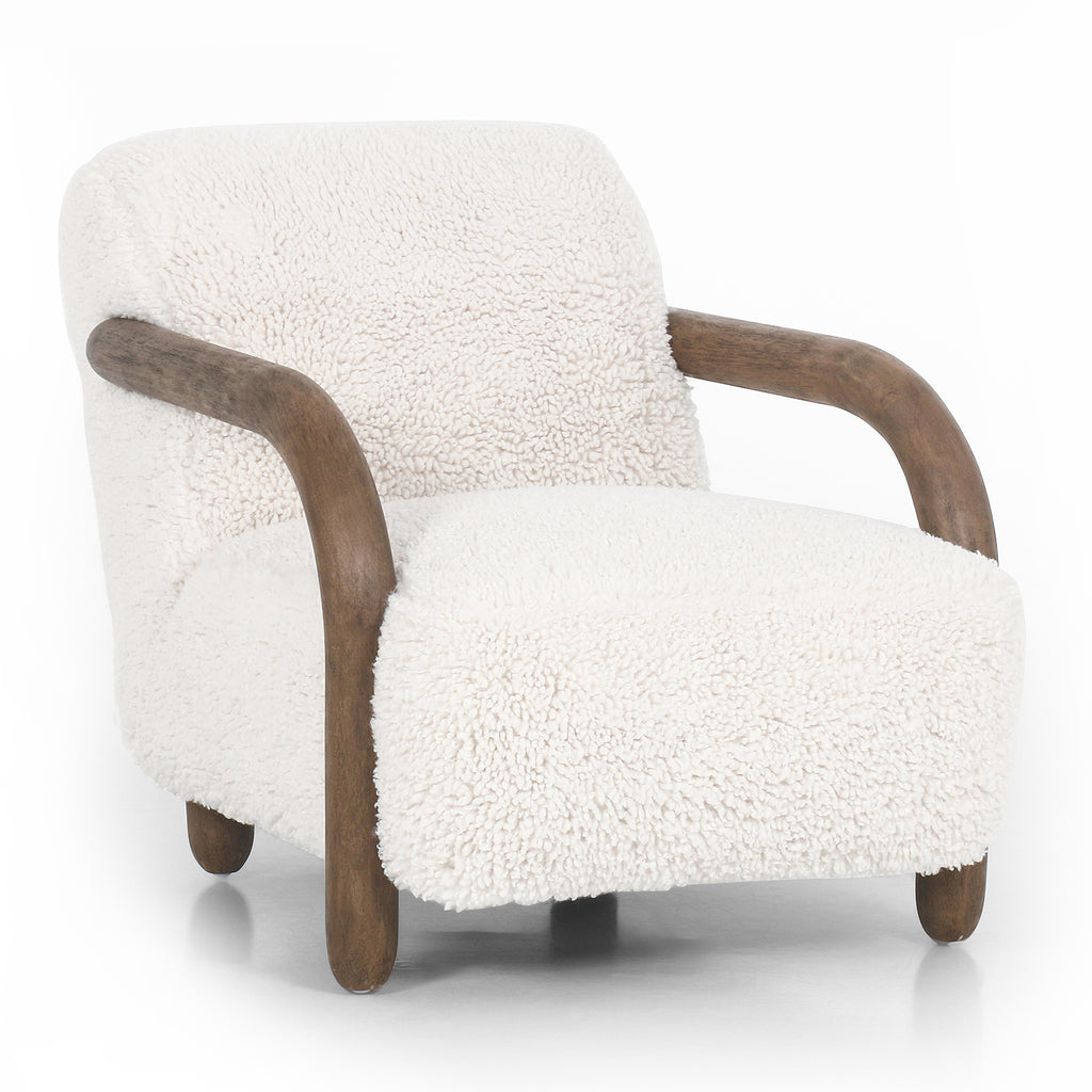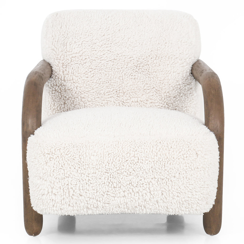 This versatile accent chair is upholstered in a faux Mongolian shearling with a textural high pile. A contrasting, chunky parawood frame hugs the seat and is wire-brushed for a warm, vintage feel.