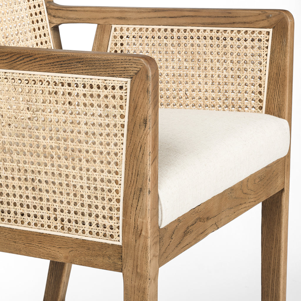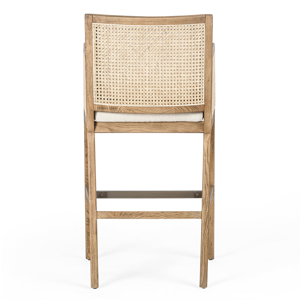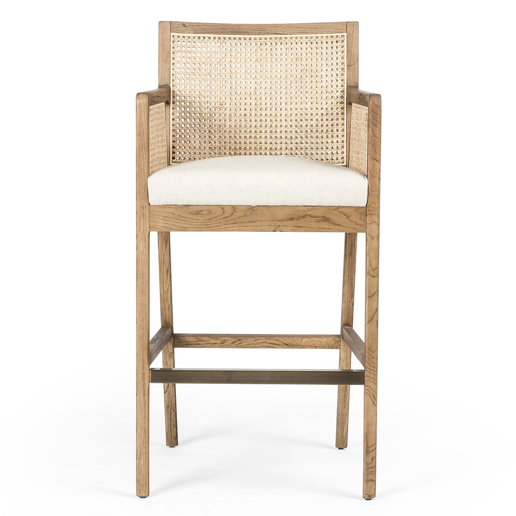 Mixed materials refresh retro bar seating. Light-toasted nettlewood frames a textural inlay of natural cane for a clean, monochromatic look, with a light, linen-blend seat of high-performance fabric for modern sensibility.