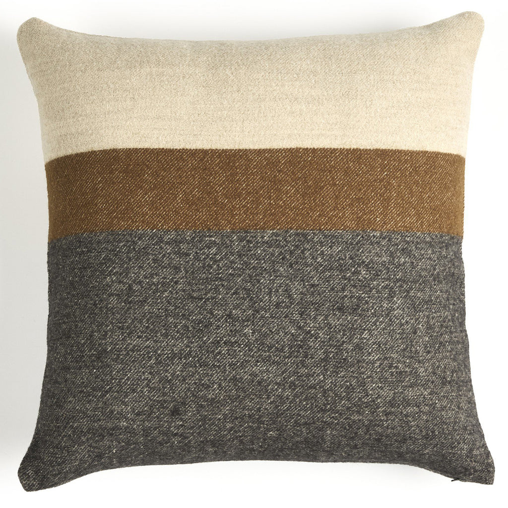 Work texture into any room with a flax/wool/linen blend throw pillow. Charcoal in color with colorblock stripe detailing. Naturally durable and soft to the touch, Libeco™-sourced linens are artisan-made without toxic chemicals.