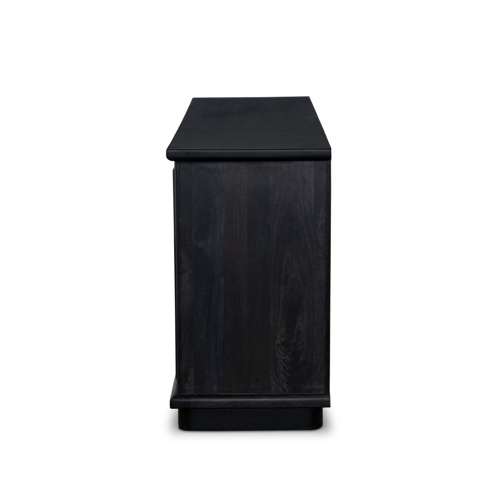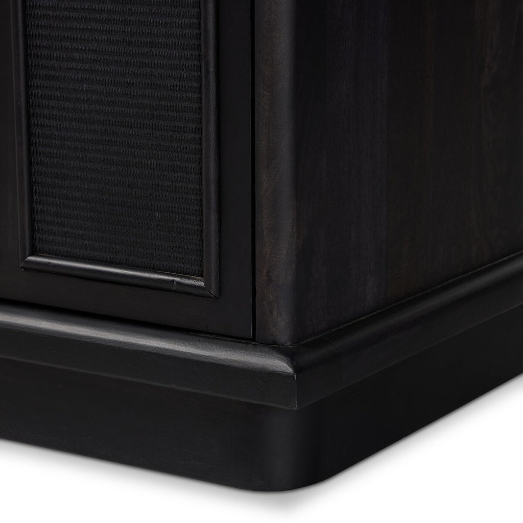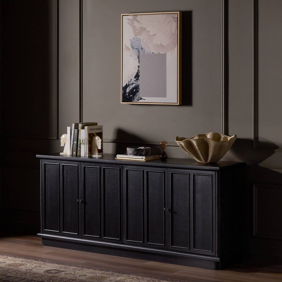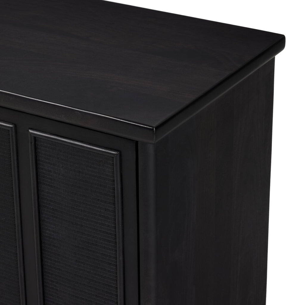 Solid mango and black paper cane fuse for a truly timeless sideboard look. A woven raffia pattern gives reeding-like texture to an eight panel, four door front. The perfect piece for storing favorite linens and serveware.