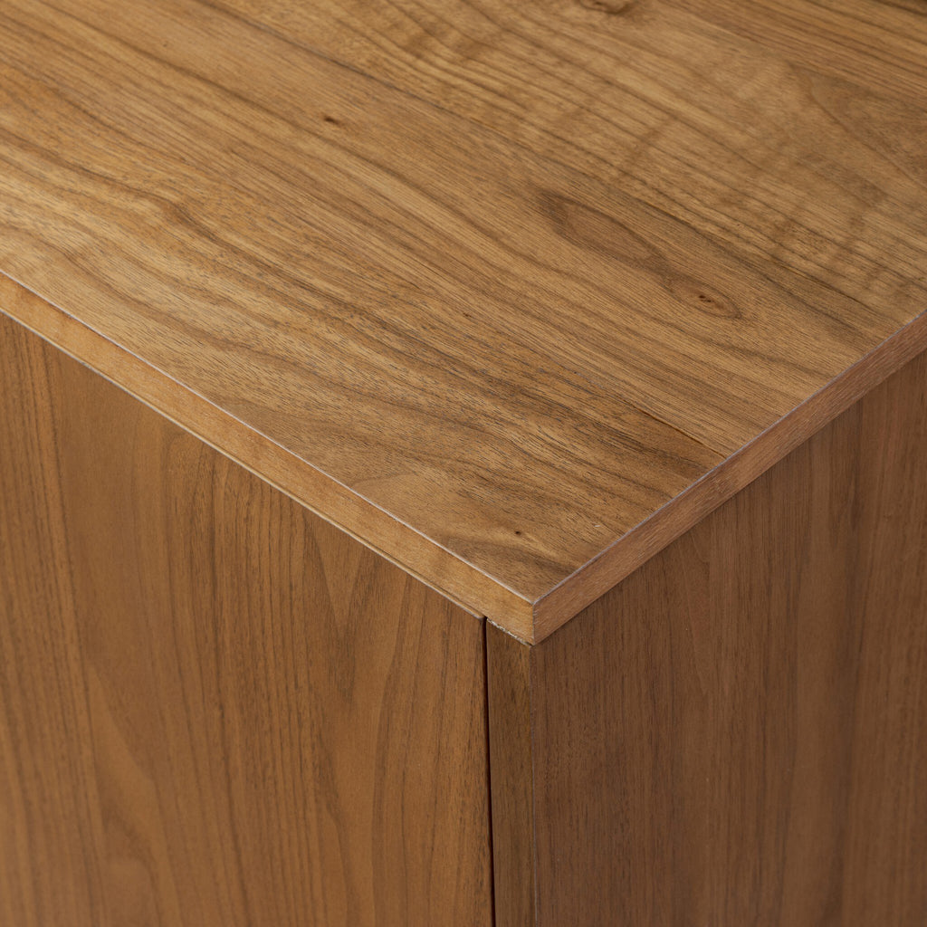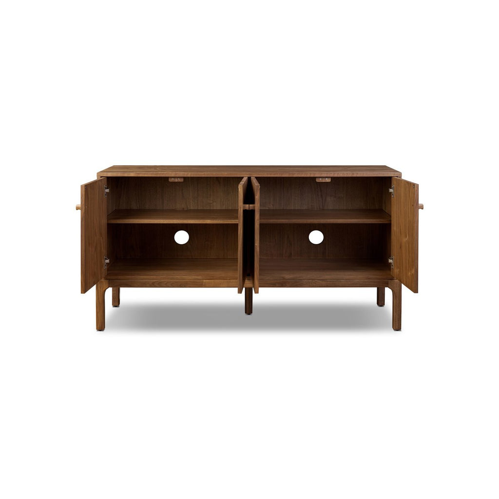 Inspired by campaign-style furniture of the 1800s — packable pieces first designed for traveling military use — a simply shaped sideboard of natural walnut features a subtly inset top and rounded legs. Finished with wooden hardware.
