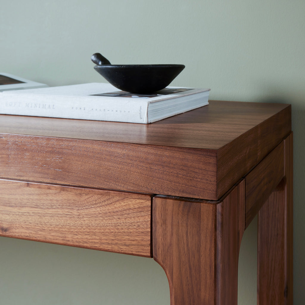 Inspired by campaign-style furniture of the 1800s — packable pieces first designed for traveling military use — a simply shaped table of natural walnut features a subtly inset top and rounded inner legs.