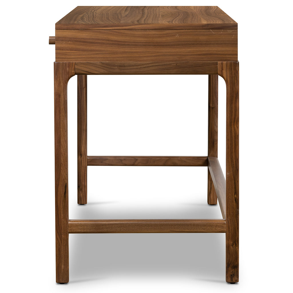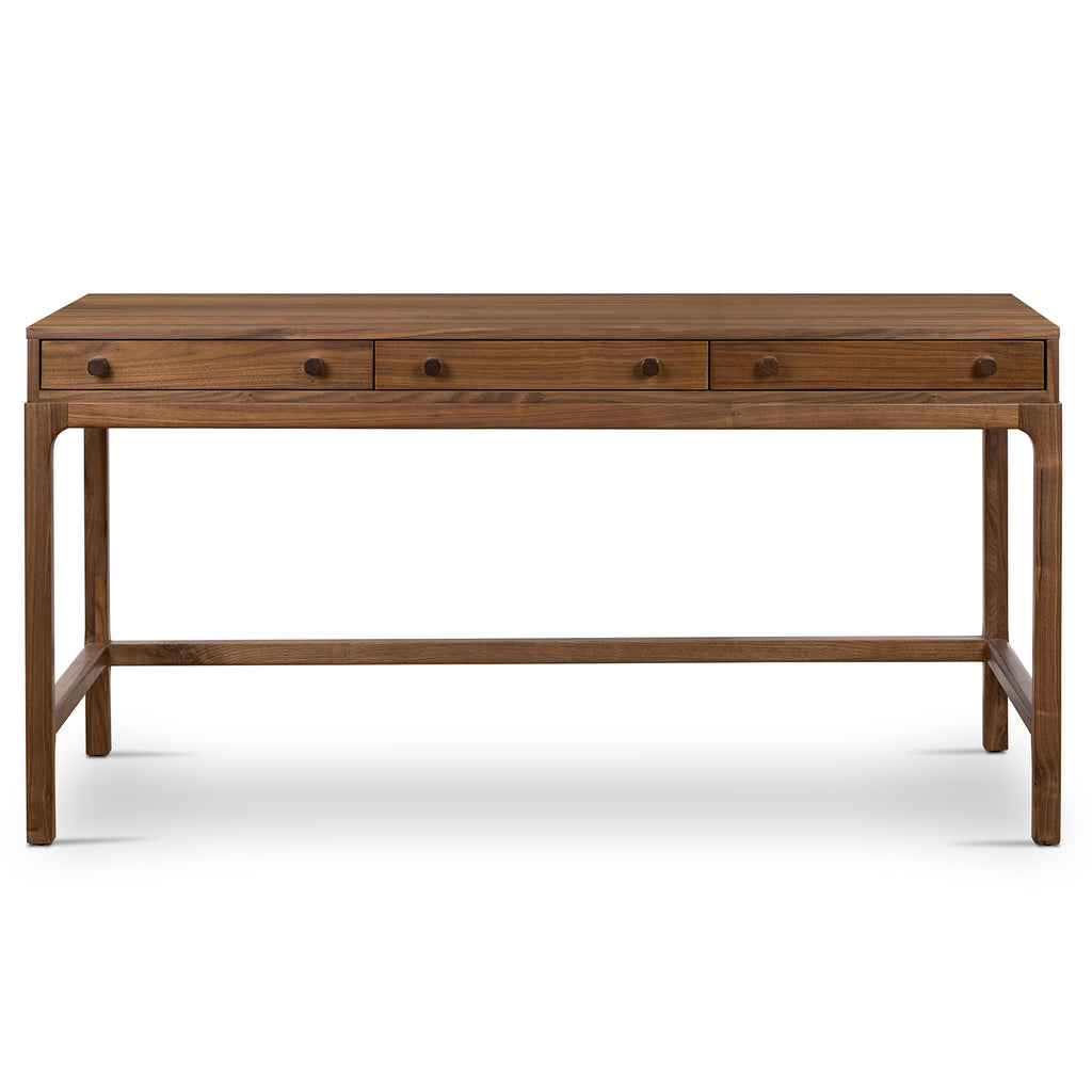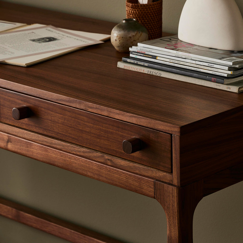 Made from solid walnut in a classic natural finish, a slim-profile desk features three drawers to keep frequently used items on hand.