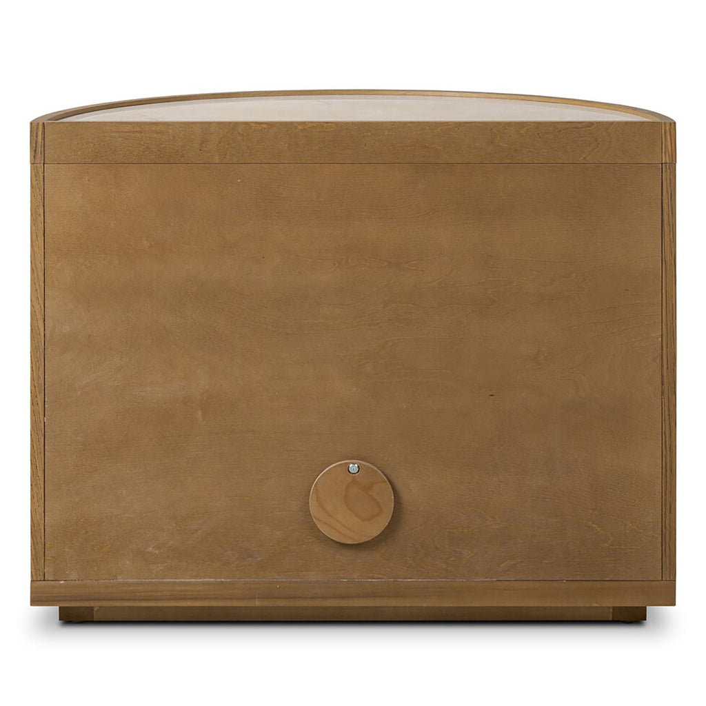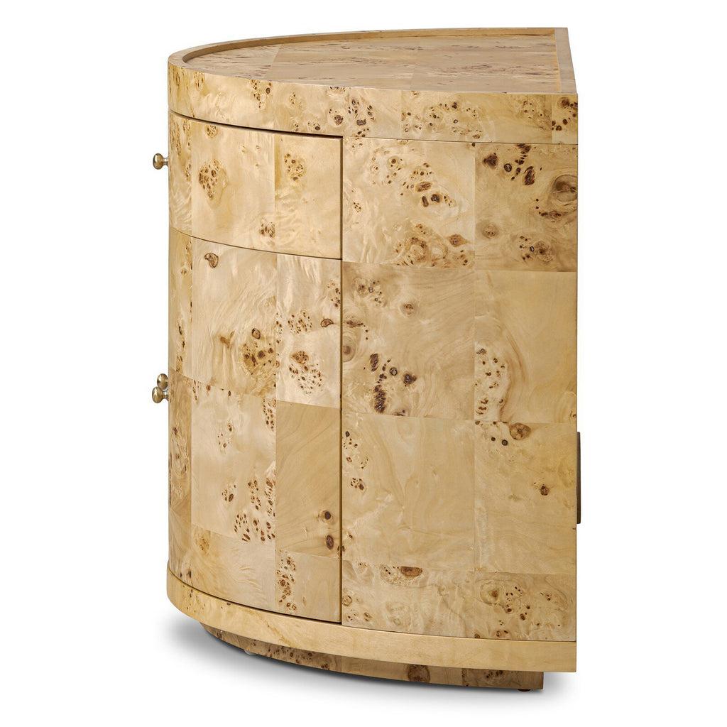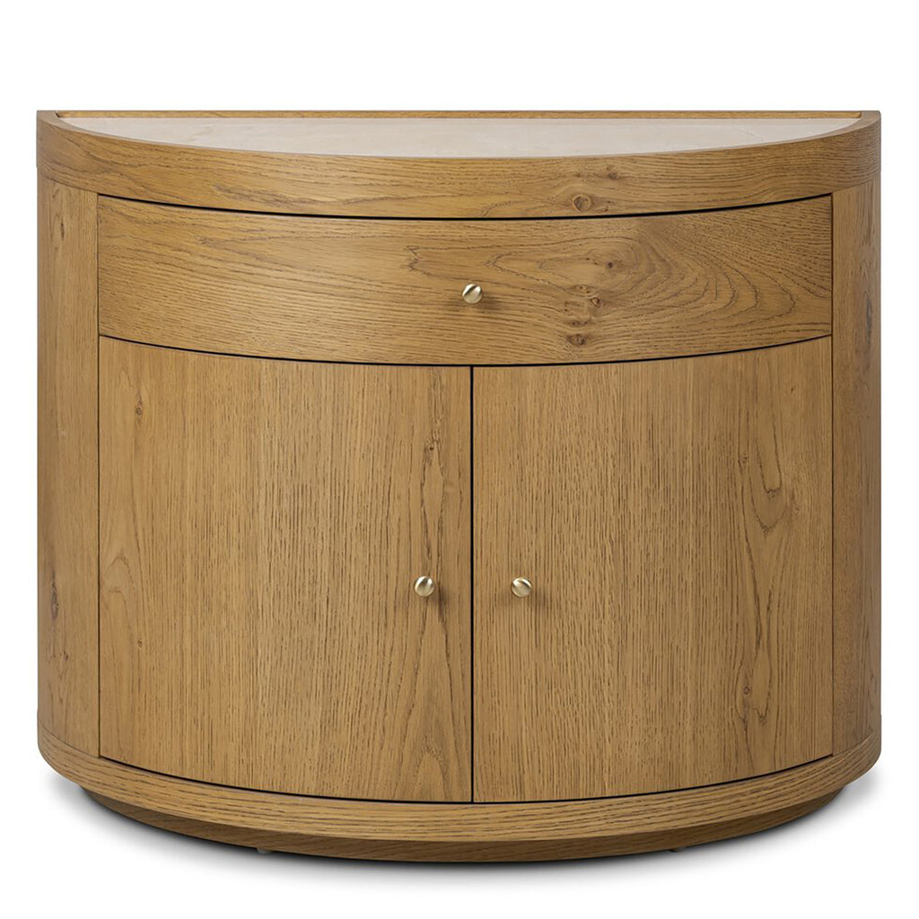 Bring a unique look to your bedroom with a demilune nightstand. An oak or poplar burl base opens to generous storage space with removable shelving, while a single drawer keeps your items within reach. A crescent tray-style top of cream marble elevates the whole look. Rear cutout for cord management.
