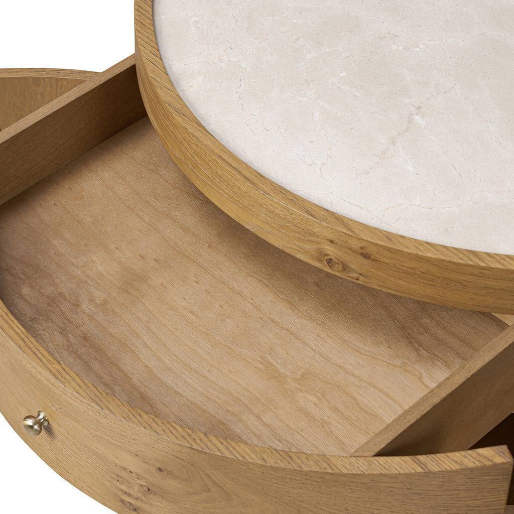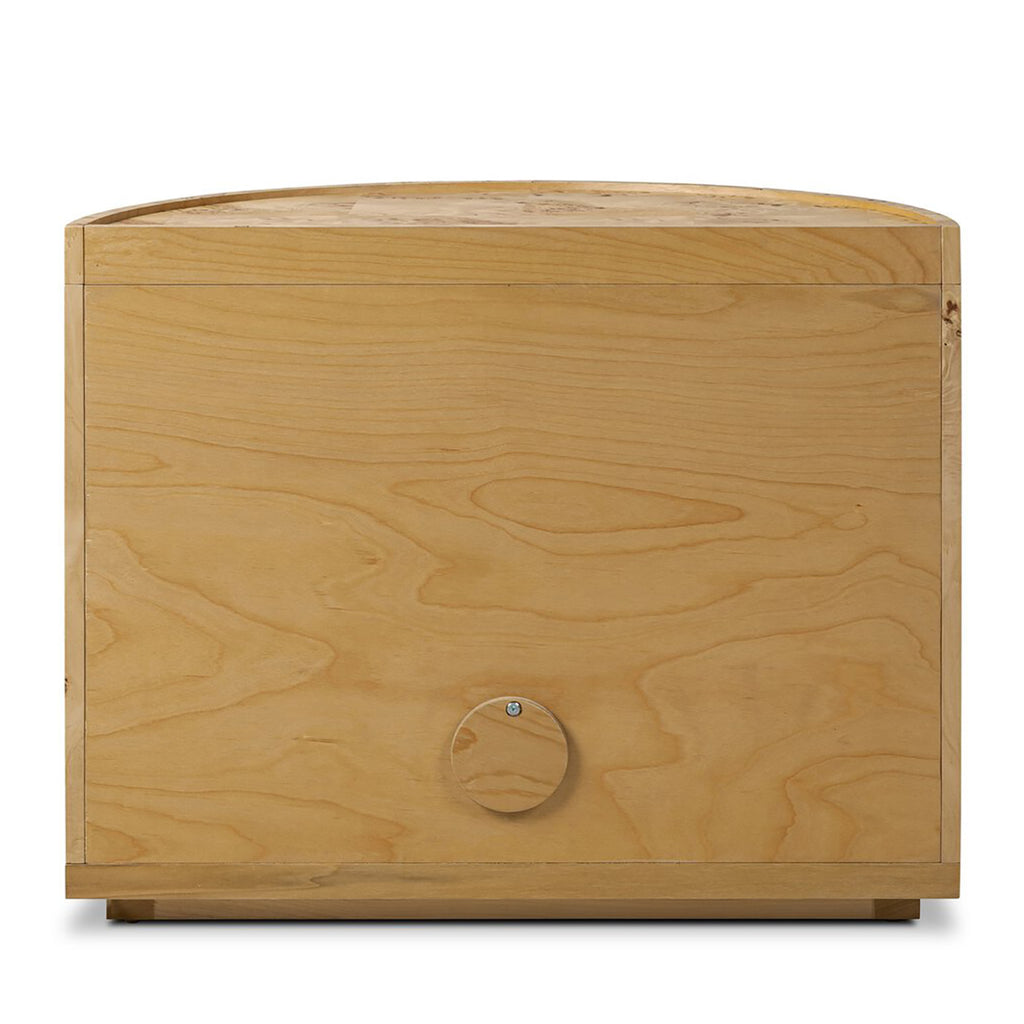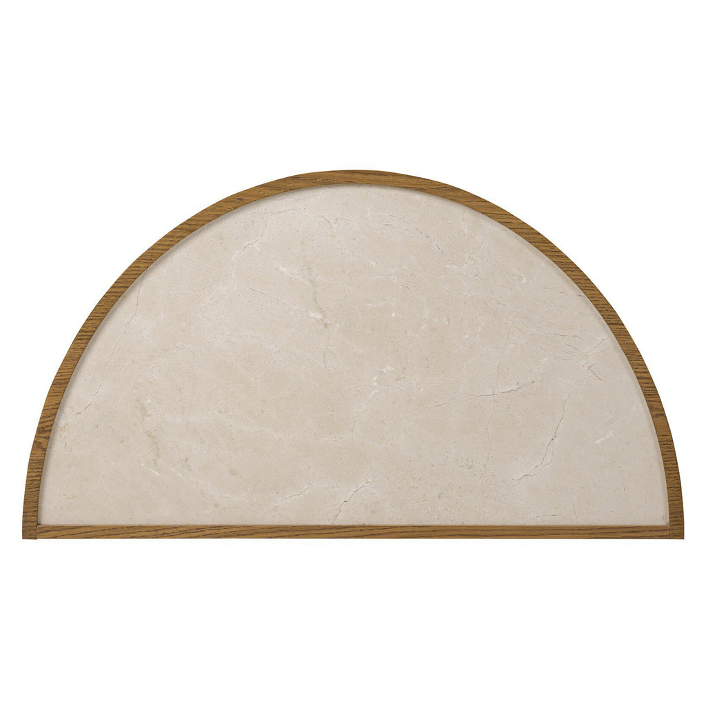 Bring a unique look to your bedroom with a demilune nightstand. An oak or poplar burl base opens to generous storage space with removable shelving, while a single drawer keeps your items within reach. A crescent tray-style top of cream marble elevates the whole look. Rear cutout for cord management.