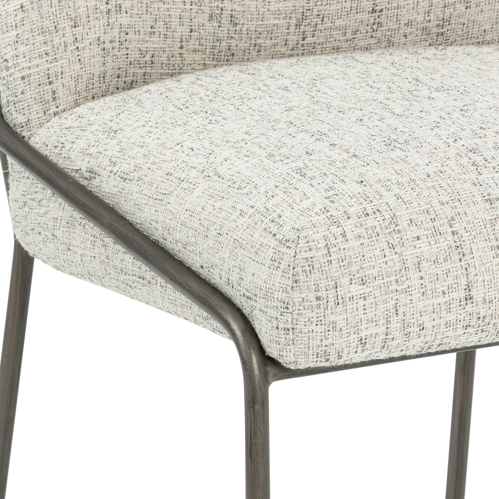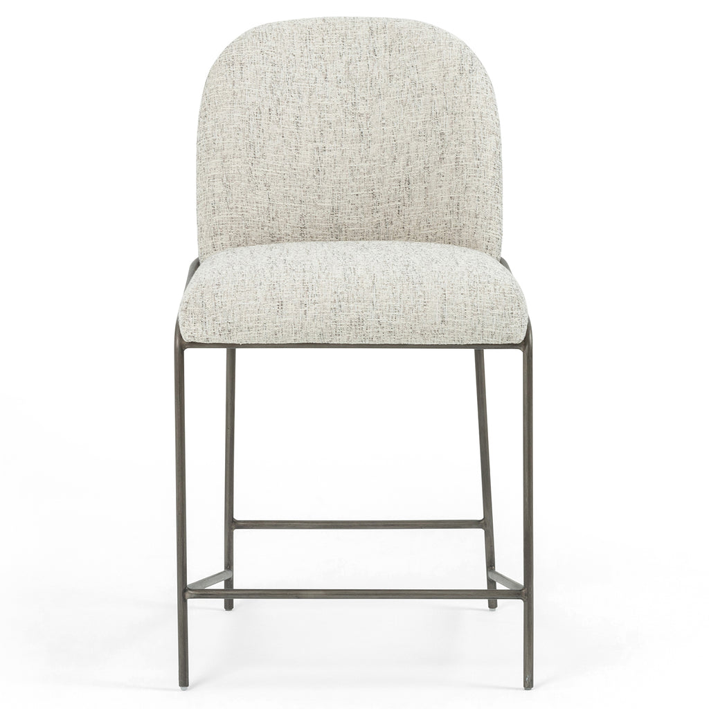 An Art Deco dream. Finely sculpted, scalloped-back counter seating of Four Hands-exclusive performance fabric pairs with slim, iron tube framing finished in a brushed slate, for a textural, fashion-forward feel with subtle feminine airs.