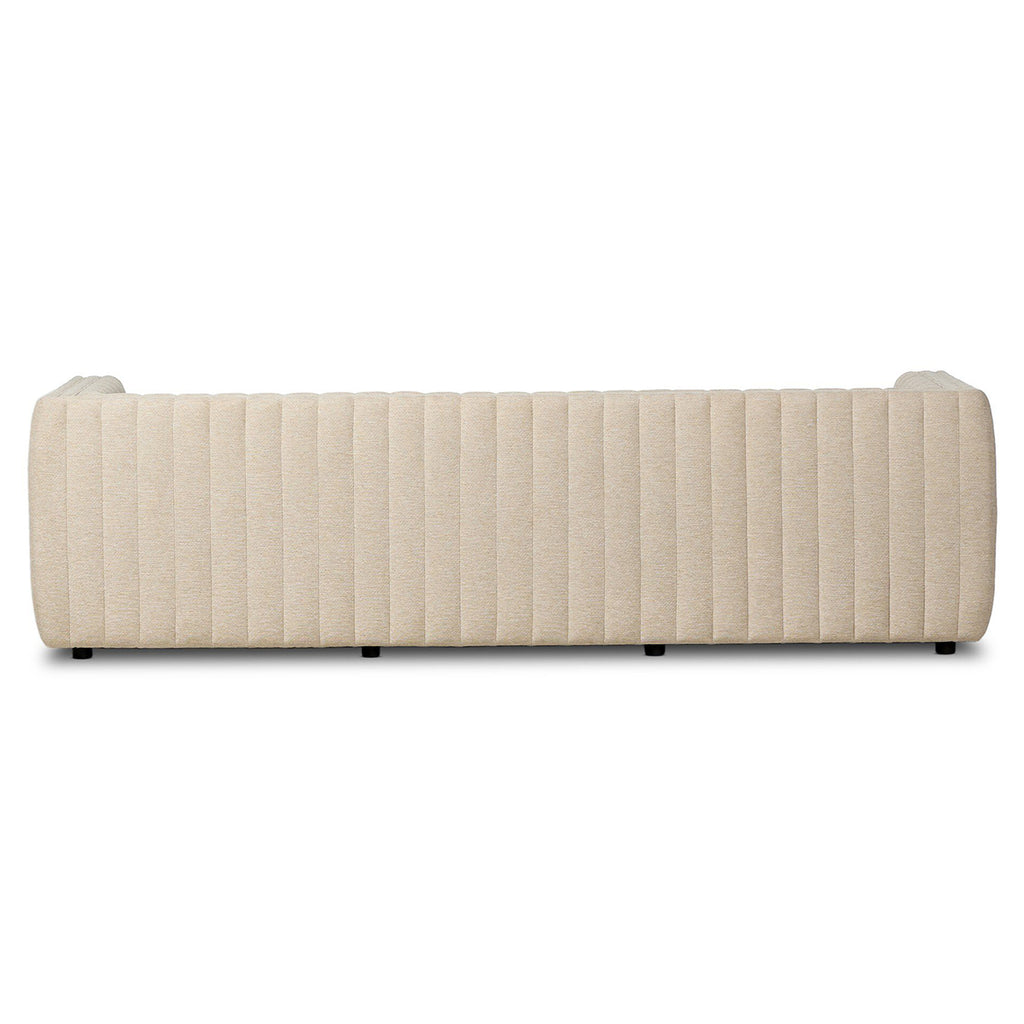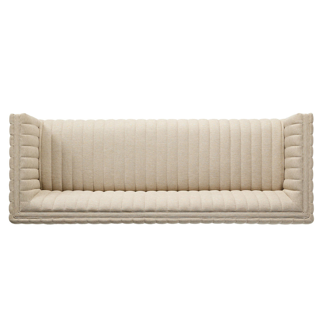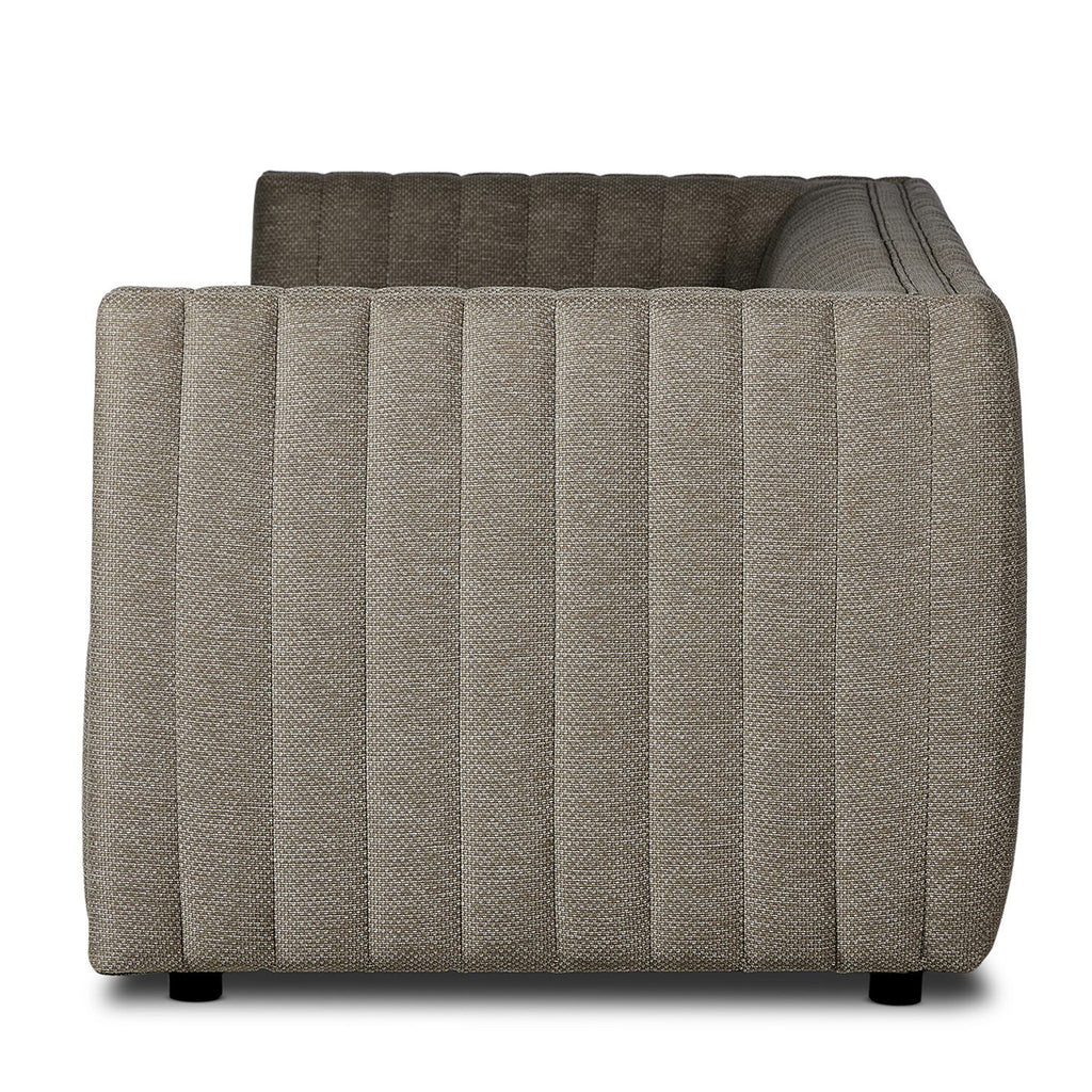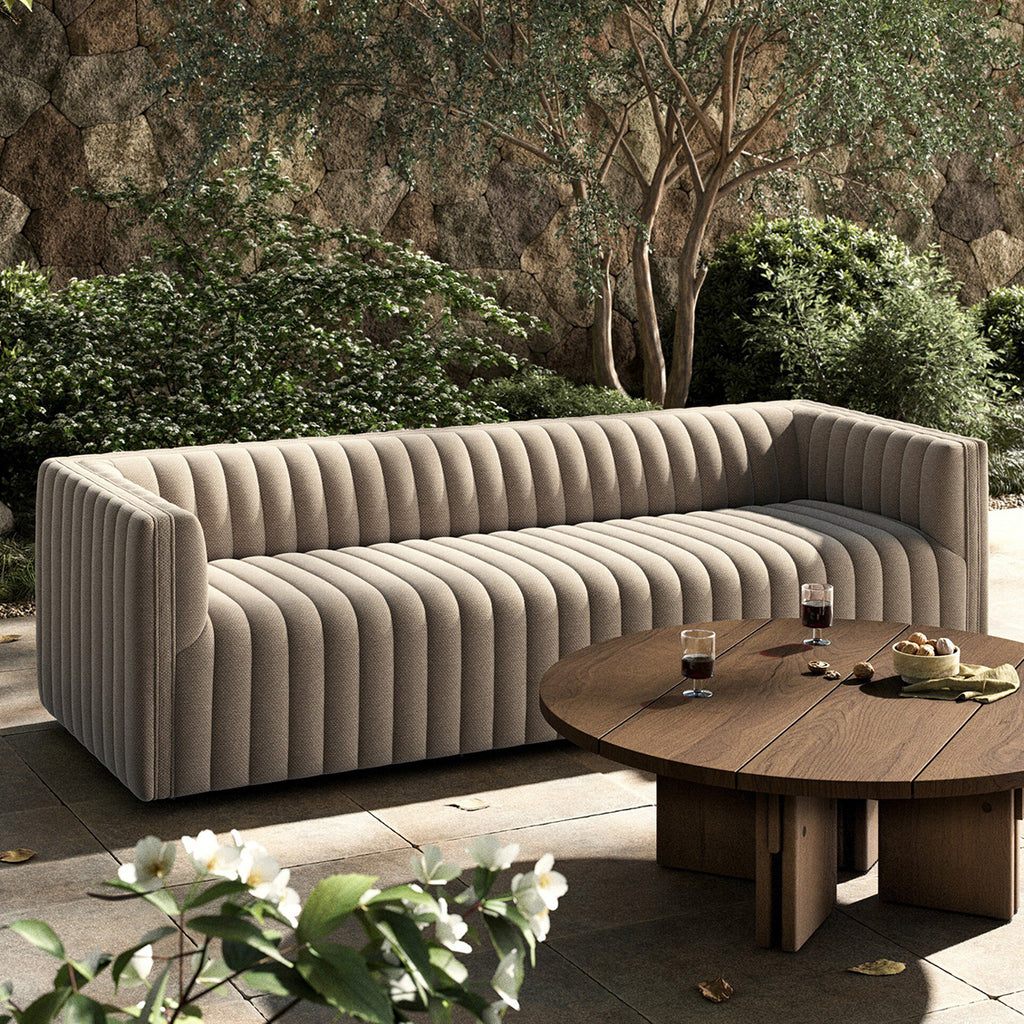 A dramatically channeled outdoor sofa with subtly textured upholstery for a clean, inviting look. Cover or store indoors during inclement weather and when not in use.
