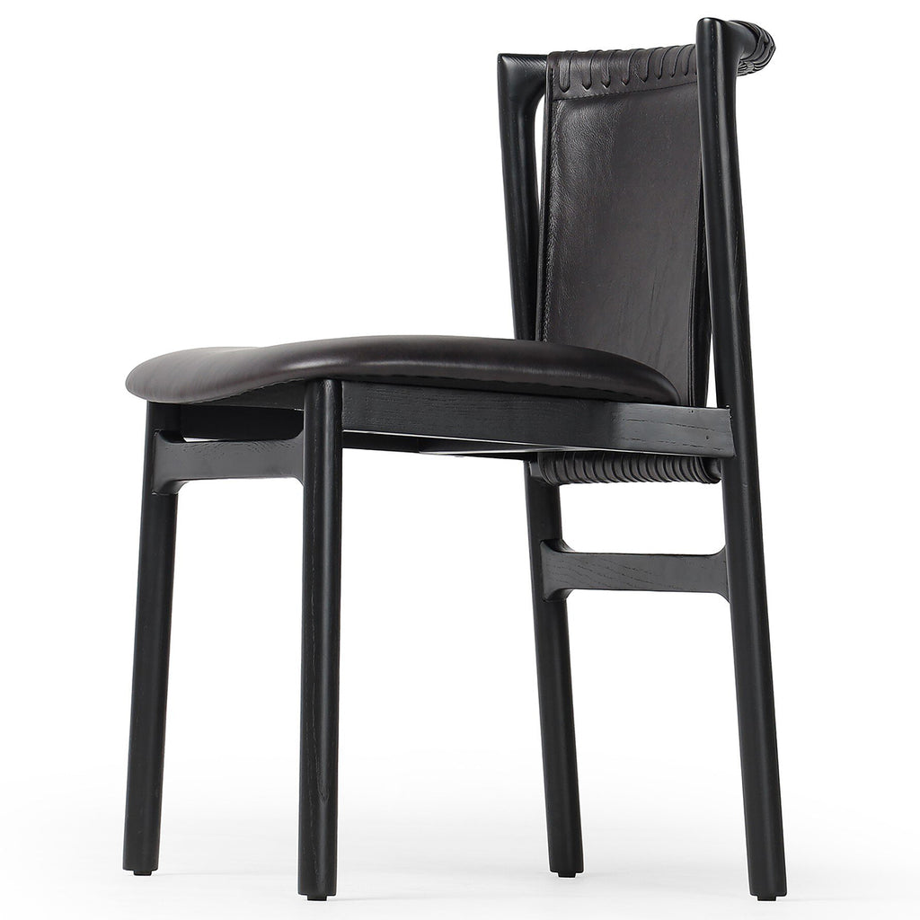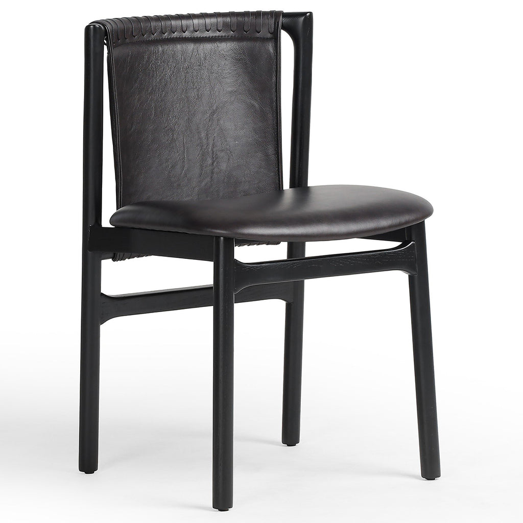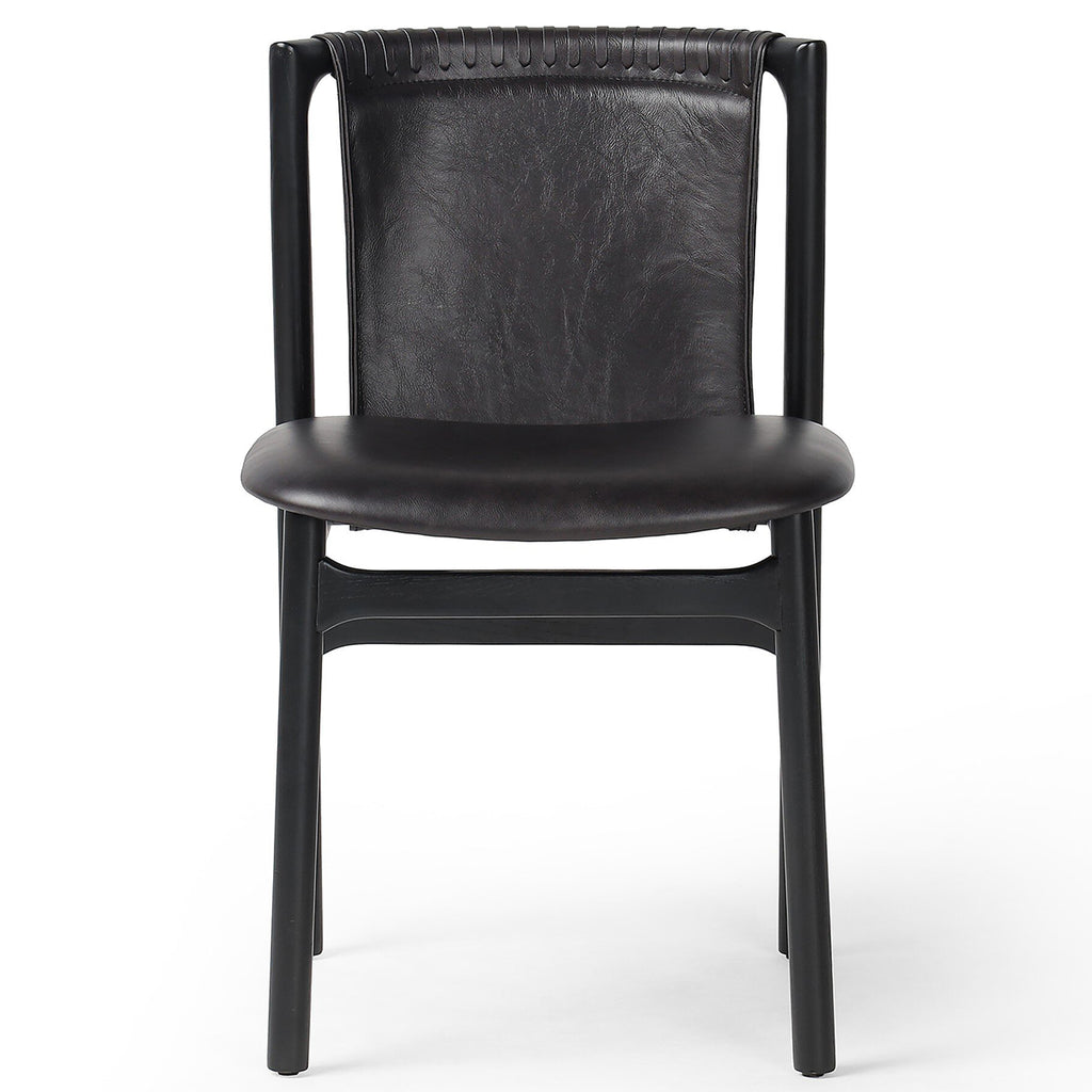 Midcentury-inspired with its minimalist wooden frame, this armless dining chair features a low back and float-like seat upholstered in top-grain leather exclusive to Four Hands. Leather wrap detailing for texture.