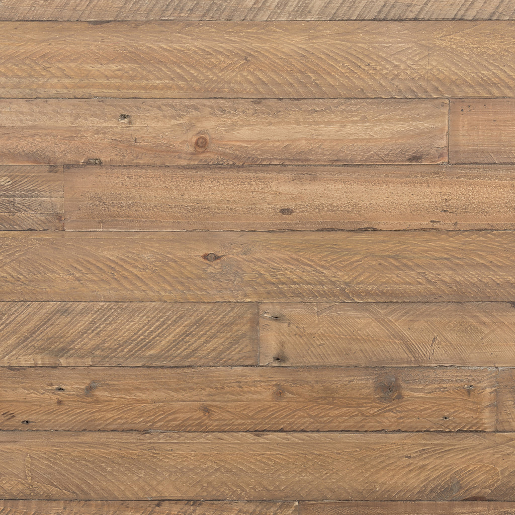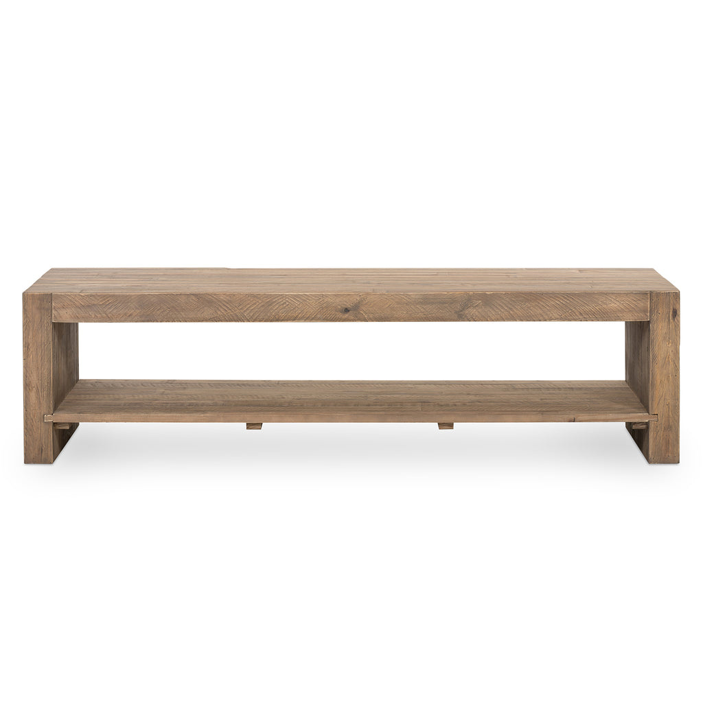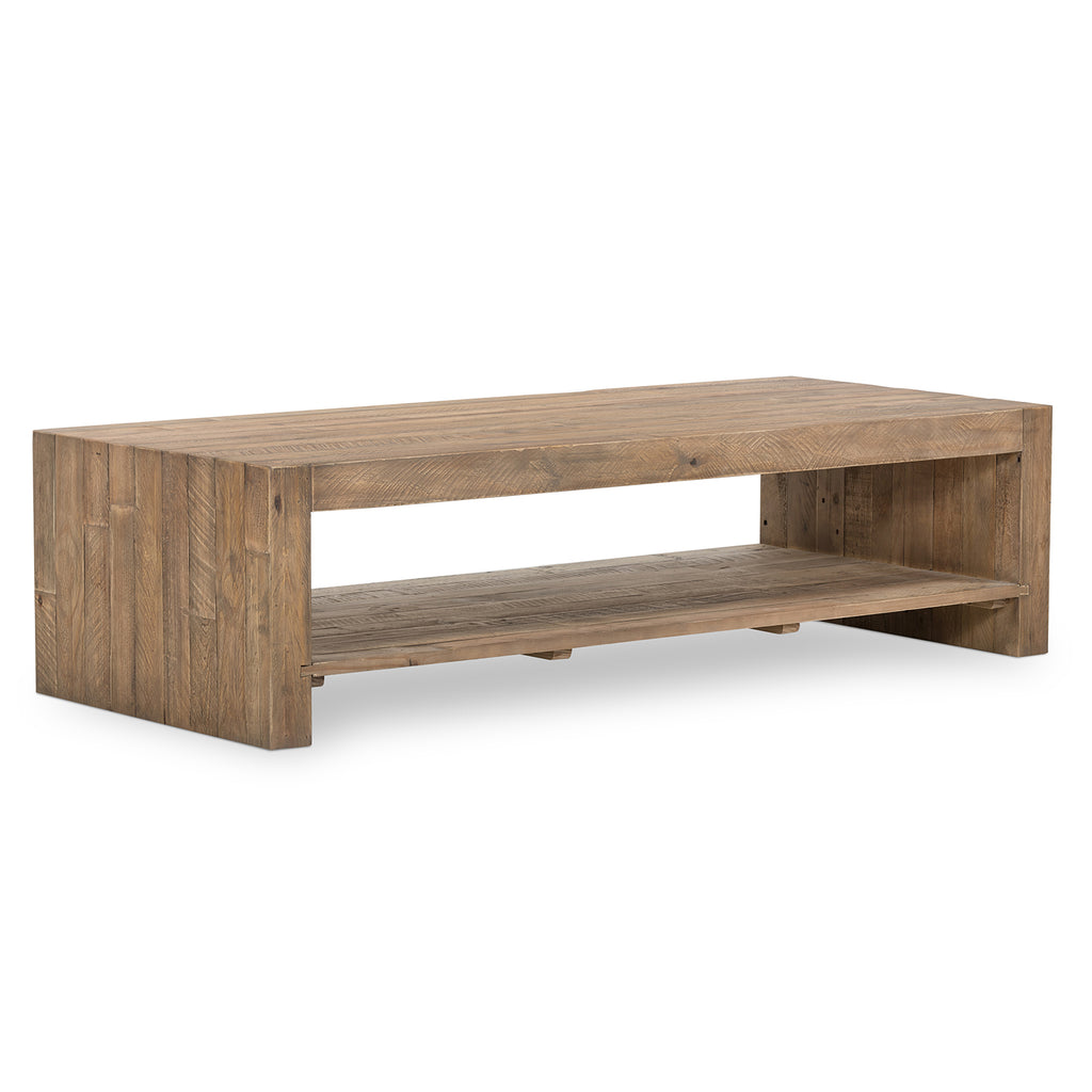 Reclaimed character woods are fashioned into the quintessential rustic coffee table. Lower shelving ups storage space, while materials' natural graining stays intact for authenticity.