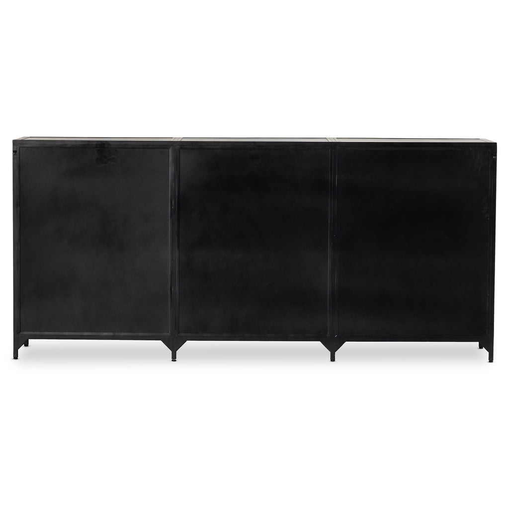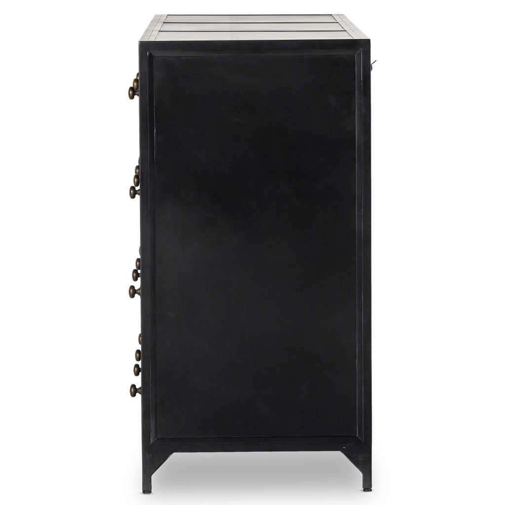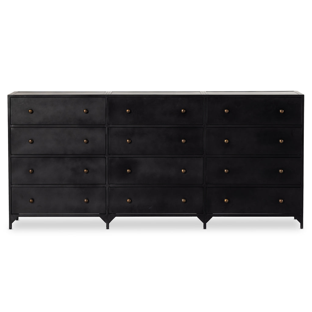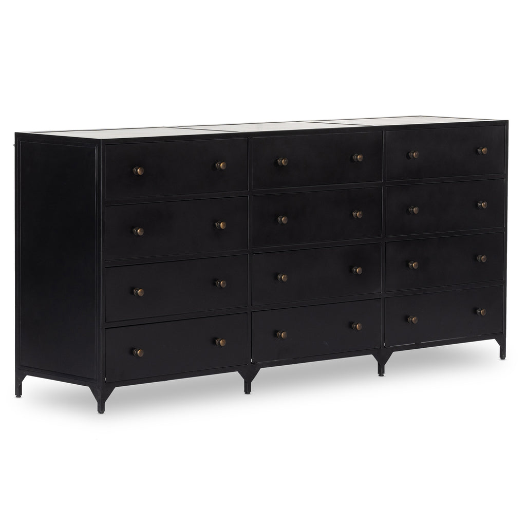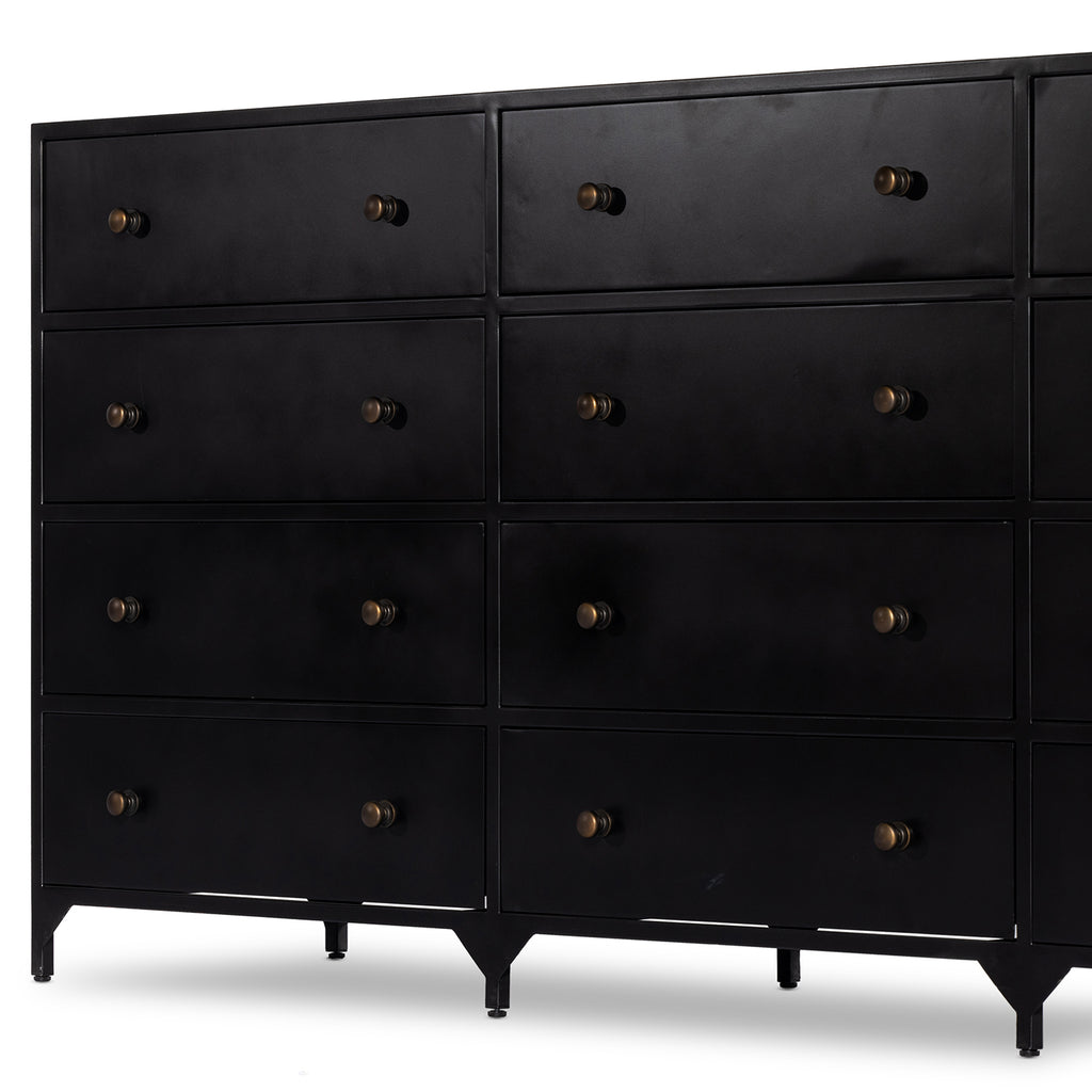 Industrial-inspired, black-finished iron forms a wide and roomy twelve-drawer dresser, with bronzed knobs for contrast.