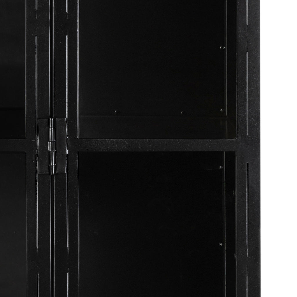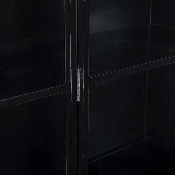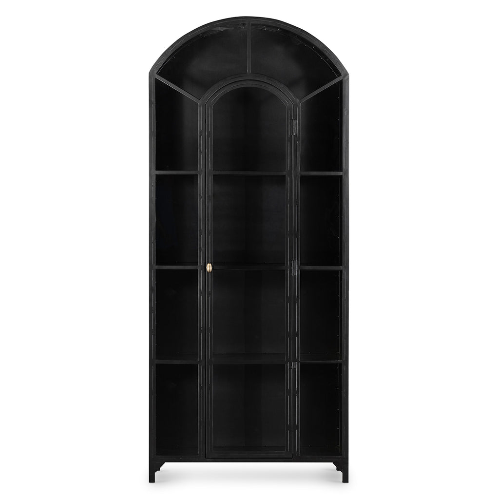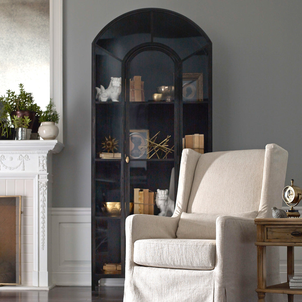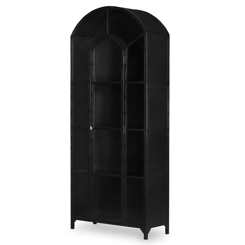 Display barware, books, or other treasures in an arch-topped cabinet. Solid iron sheeting is finished in soft, matte black or modern gunmetal with clear glass fronts.