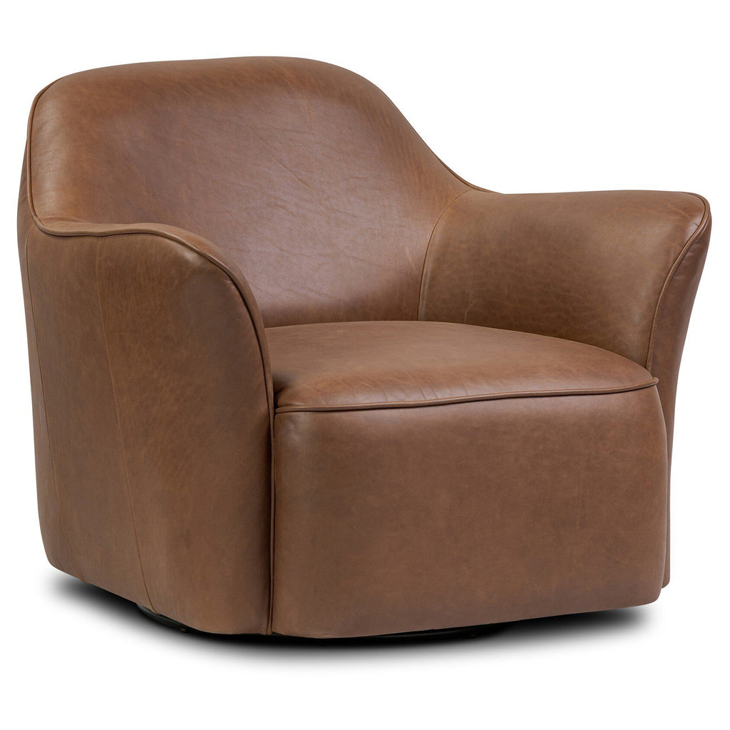 Smooth lines and impeccable tailoring bring a clean, elevated look to this modernized 360 swivel chair. Made from top-grain leather with a rich mahogany finish, flared arms and piping trim reflect the intention behind this timeless design.