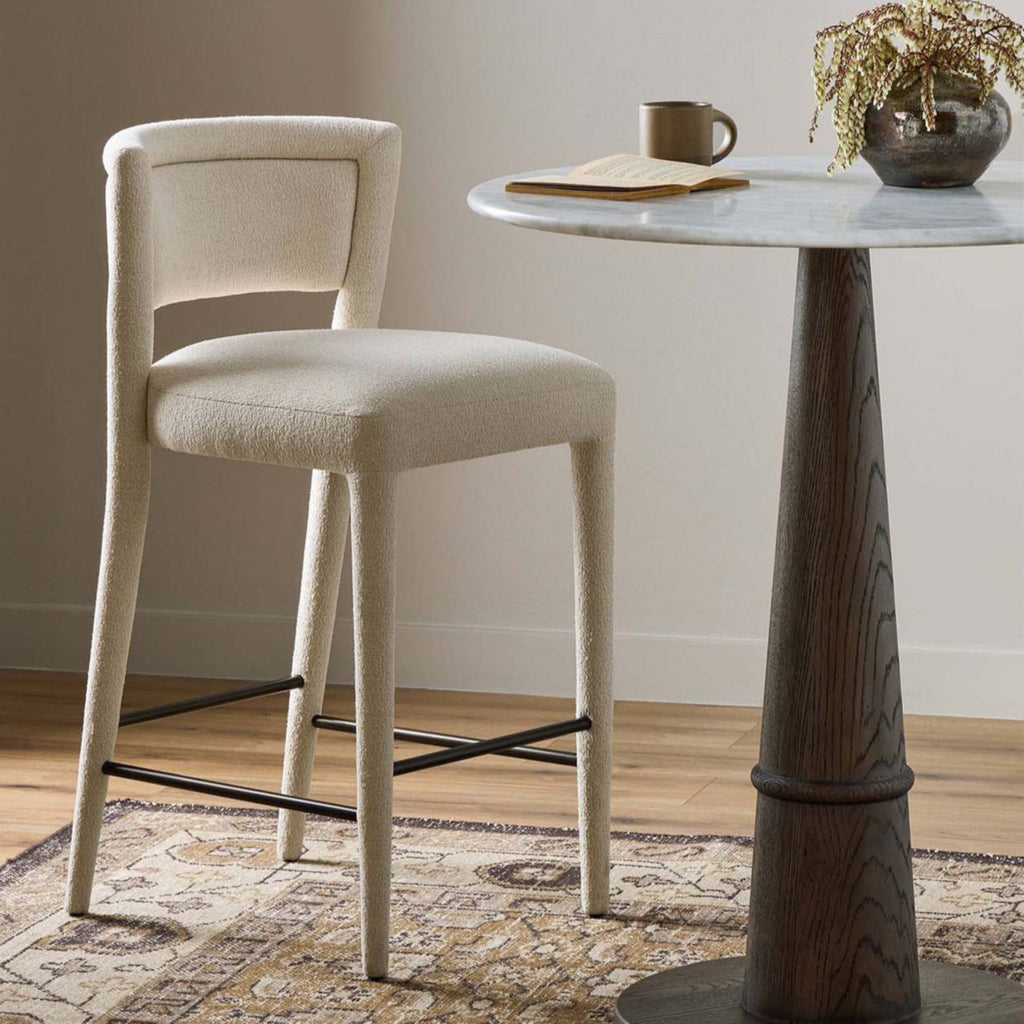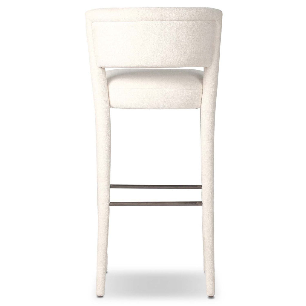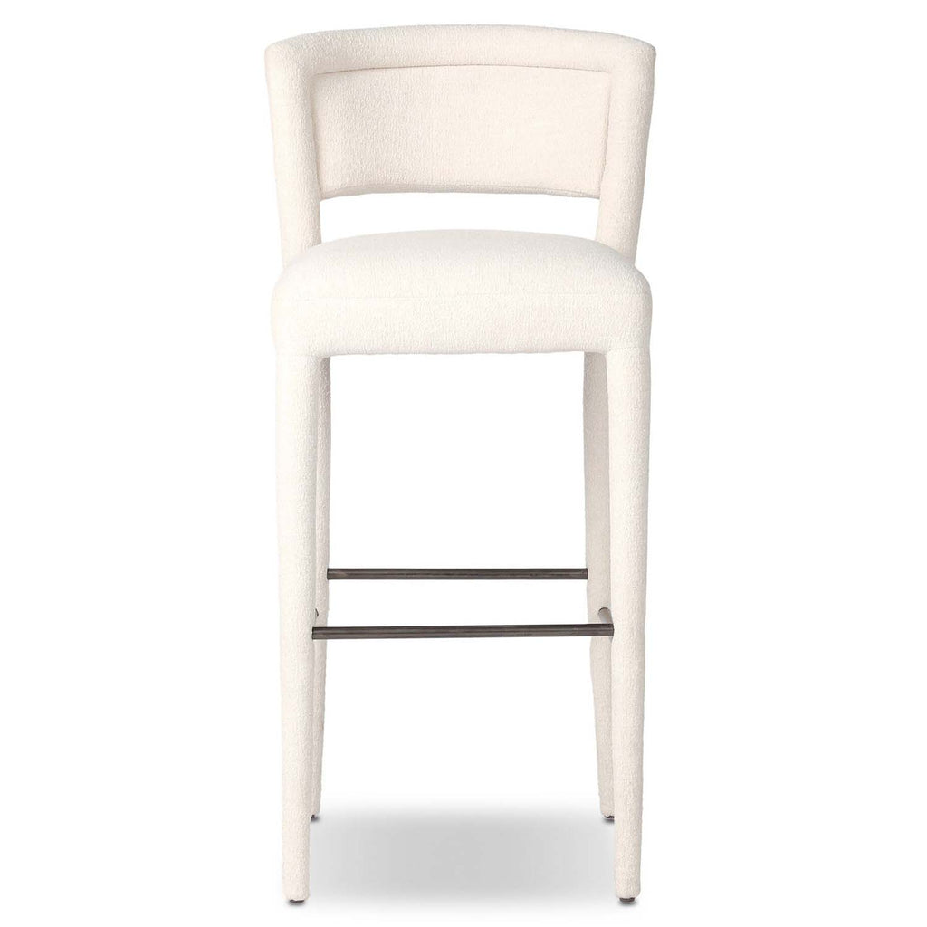 Featuring a barrel back design for comfort, a bar stool is fully upholstered in snow white Crypton® performance fabric. Tapered cylindrical legs connect around the back frame. Crypton® performance fabric is specially engineered for protection against stains, moisture and odor.