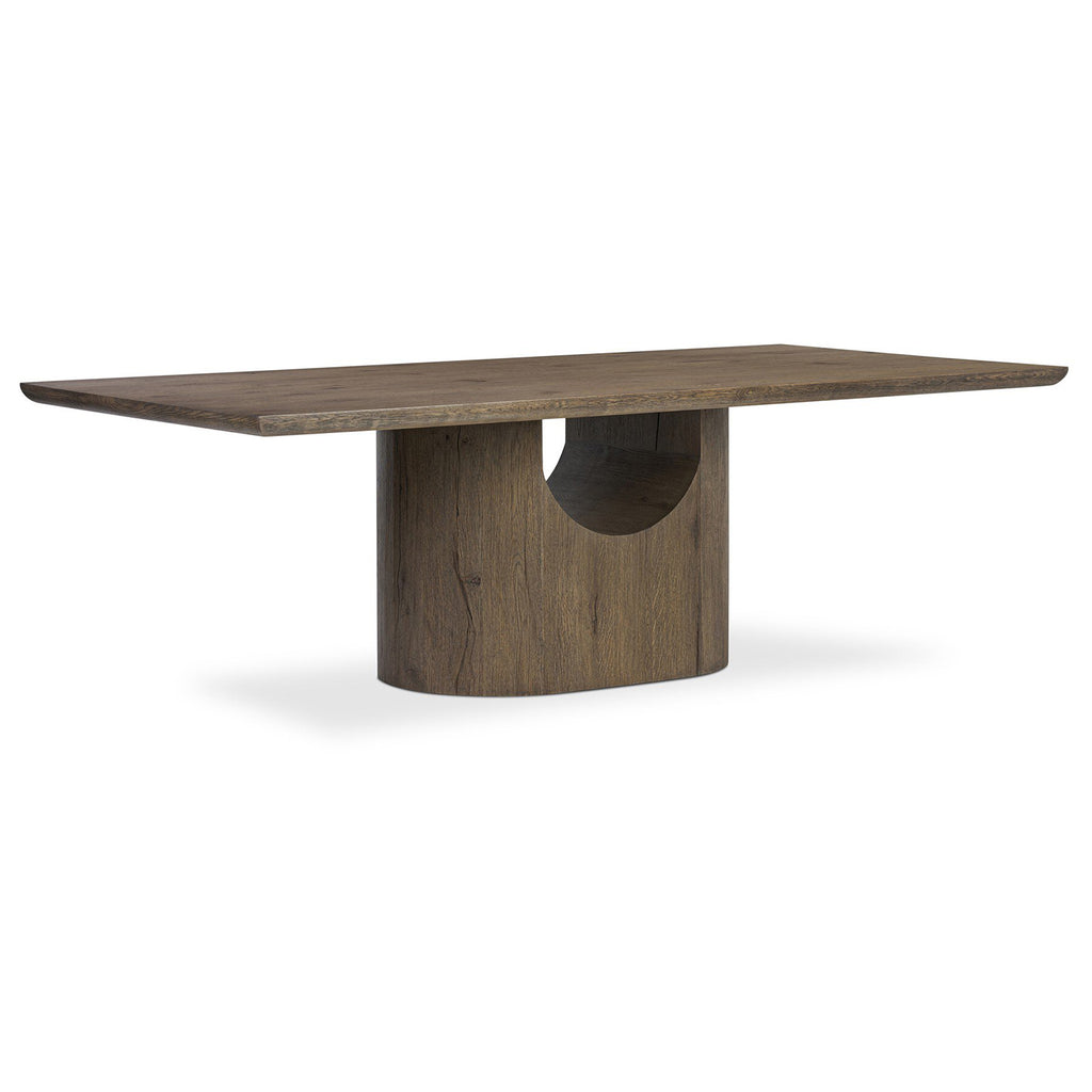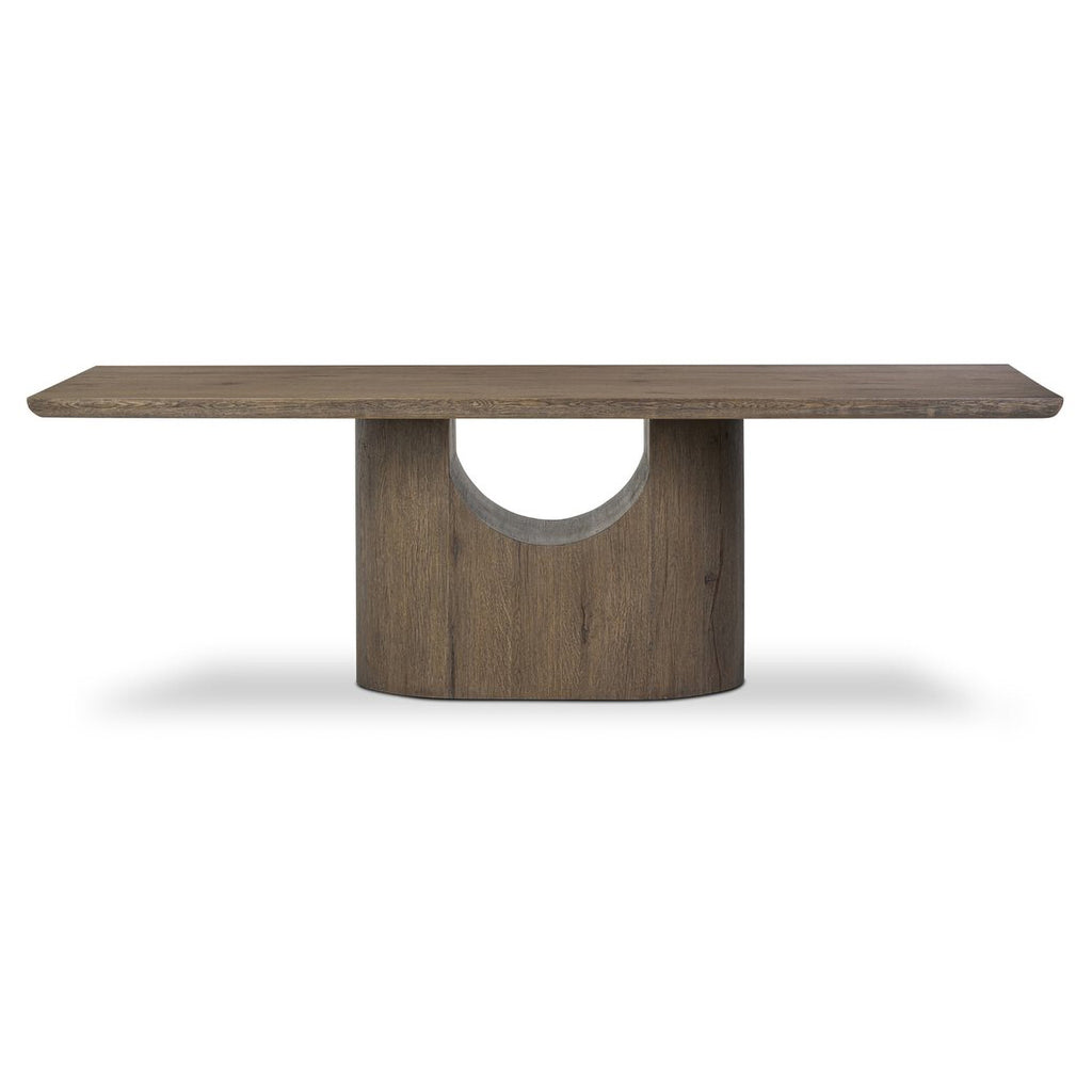 Beautifully heavy oak shape shifts. Finished in a moody brown, a streamlined rectangular top contrasts a heavy capsule base with a hollow arch for a light and airy design element.