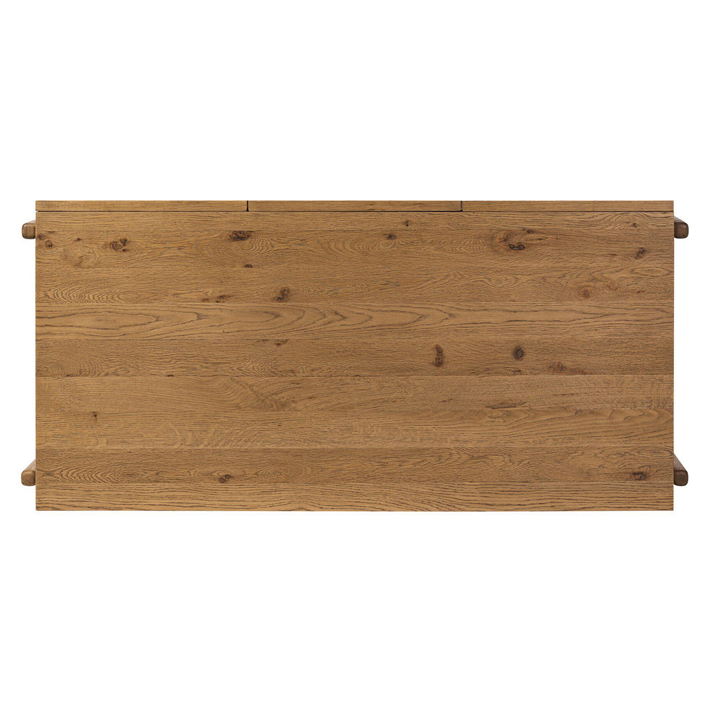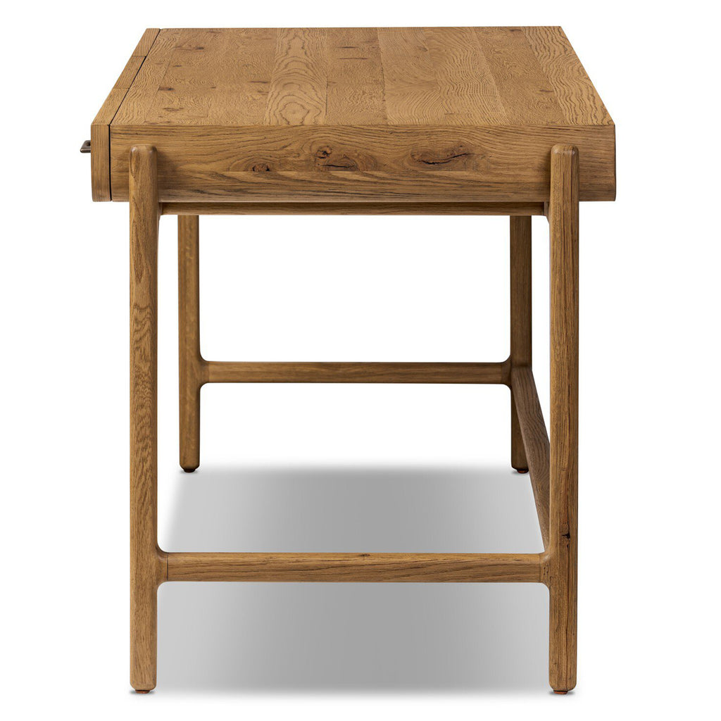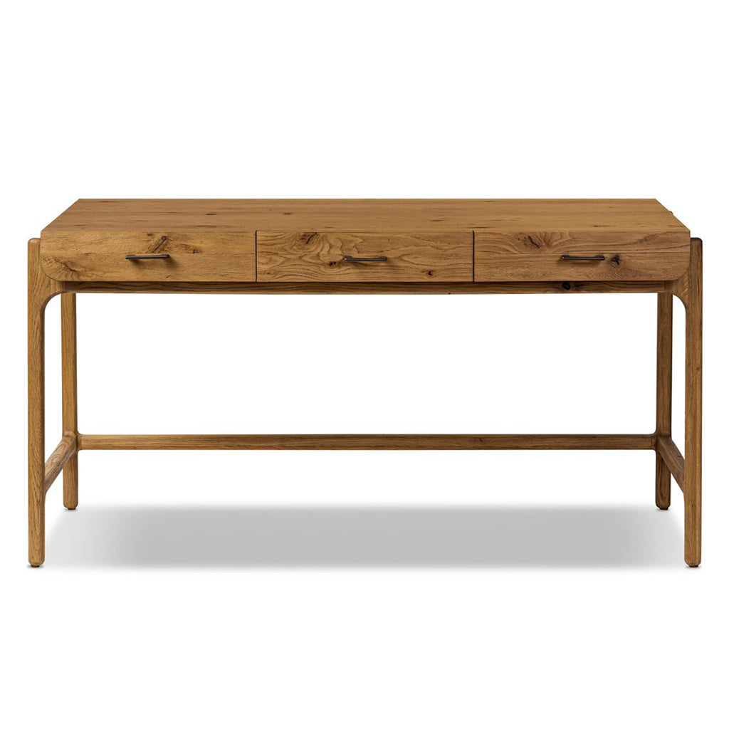 With a slim profile and light, worn finish, this oak desk works effortlessly into a range of spaces and styles. Contour-driven, with radius legs and cradle casing, plus three drawers finished with simple iron hardware in an oil-rubbed bronze.